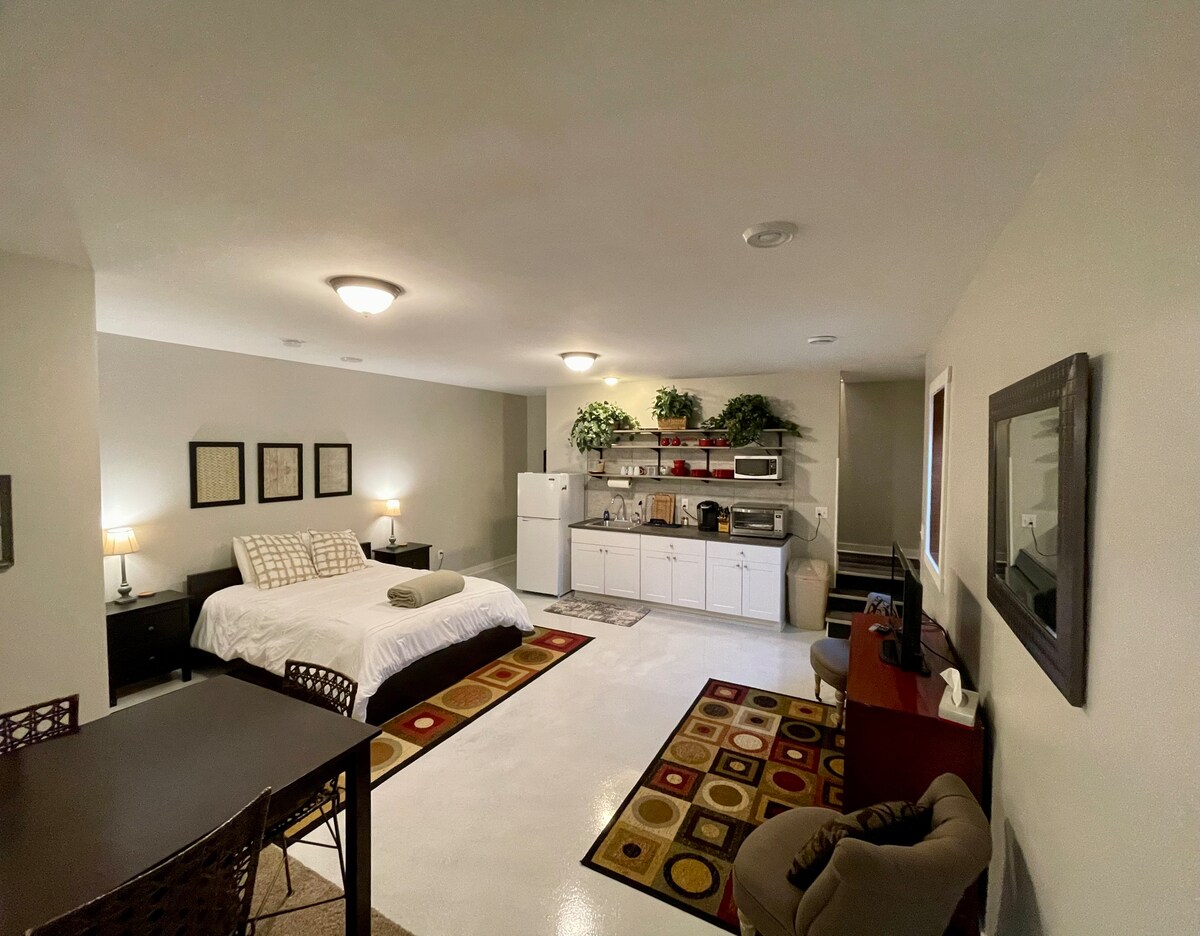 Enter through a private entrance to this basement studio apartment. Newly constructed in 2018, the space is well lit, insulated, and in a quiet neighborhood. Enjoy a full bathroom with laundry, and a kitchenette: 4.5 cu.ft. refrigerator, microwave, extra large toaster oven, hot plate, crock pot, pots, pans, dishes, keurig coffee machine, and full kitchen sink. 1 queen bed accommodates up to two guests. Guests must have at least 3 positive stay reviews to book our space.