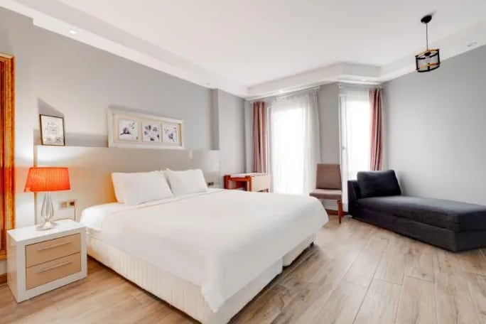 16 odalı butik otelimizin 1. katında bulunan 2 kişilik Deluxe odamızda çift kişilik yatak, açılabilir koltuk, bistro mutfak ve salon(oturma alanı) bulunmaktadır.