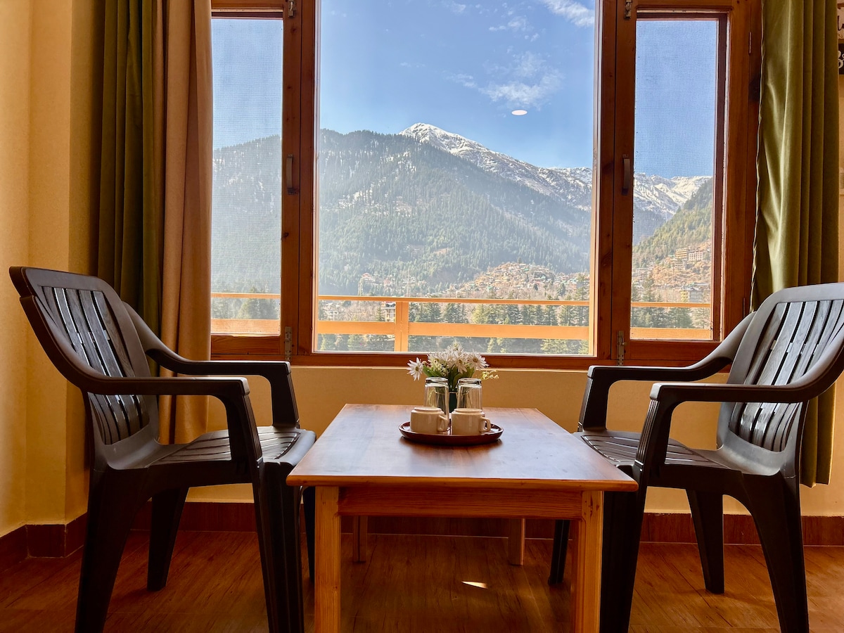 Property Name: The Panorama Retreat, Manali Centrally located | Just 10 mins/1.5 kms drive to Mall Road "Panoramic Mountain View" Room Located on Second Floor | Complimentary Breakfast | Mountain View | Attached Balcony | Complimentary Room Heater | Complimentary Bed Warmer | Alpine Grade Duvet | Very Comfortable Bedding | Attached Washroom | Onsite Free Parking | Spacious | Timeless Interiors | 43 inch Smart TV | Tea & Coffee Amenities | Kettle | Professionally Cleaned | Hygienic | Hot Water