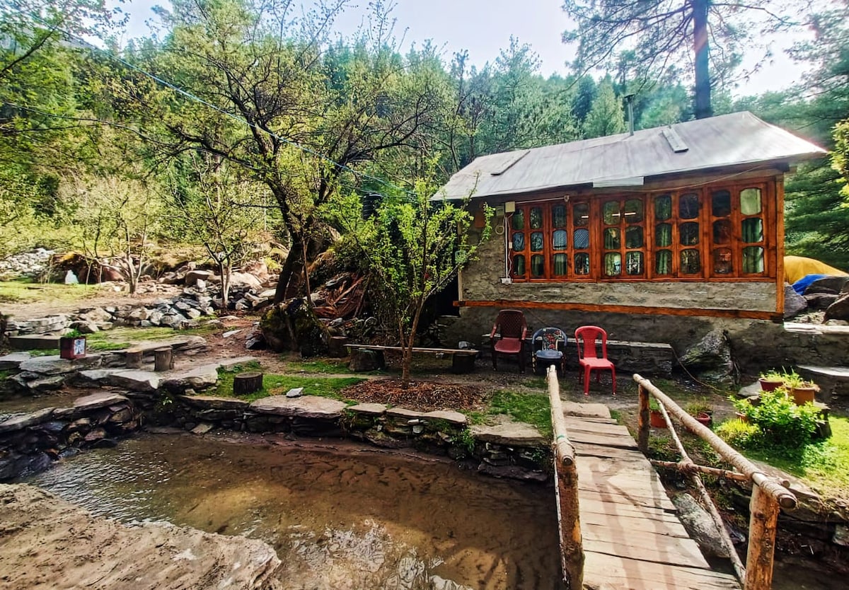 Luxurious traditional-style 2 Room set in Haripur, Manali, with a 360° unrestricted mountain view and tranquility. ✨ Highlights: 🚗 Spacious Parking 🍀 Restaurants, Waterfall, Bank, ATM, Gym nearby 🍀 Veg, Vegan and Jain food friendly property. 🏡 Cozy & Comfortable Ambiance With Full Tower 5G Coverage 🚿 1 Attached Washroom with Hot Shower 📺 Jio AirFiber (100 mbps with backup) 🌲 Surrounded by Nature More than just a stay, our space is a tribute to the earth