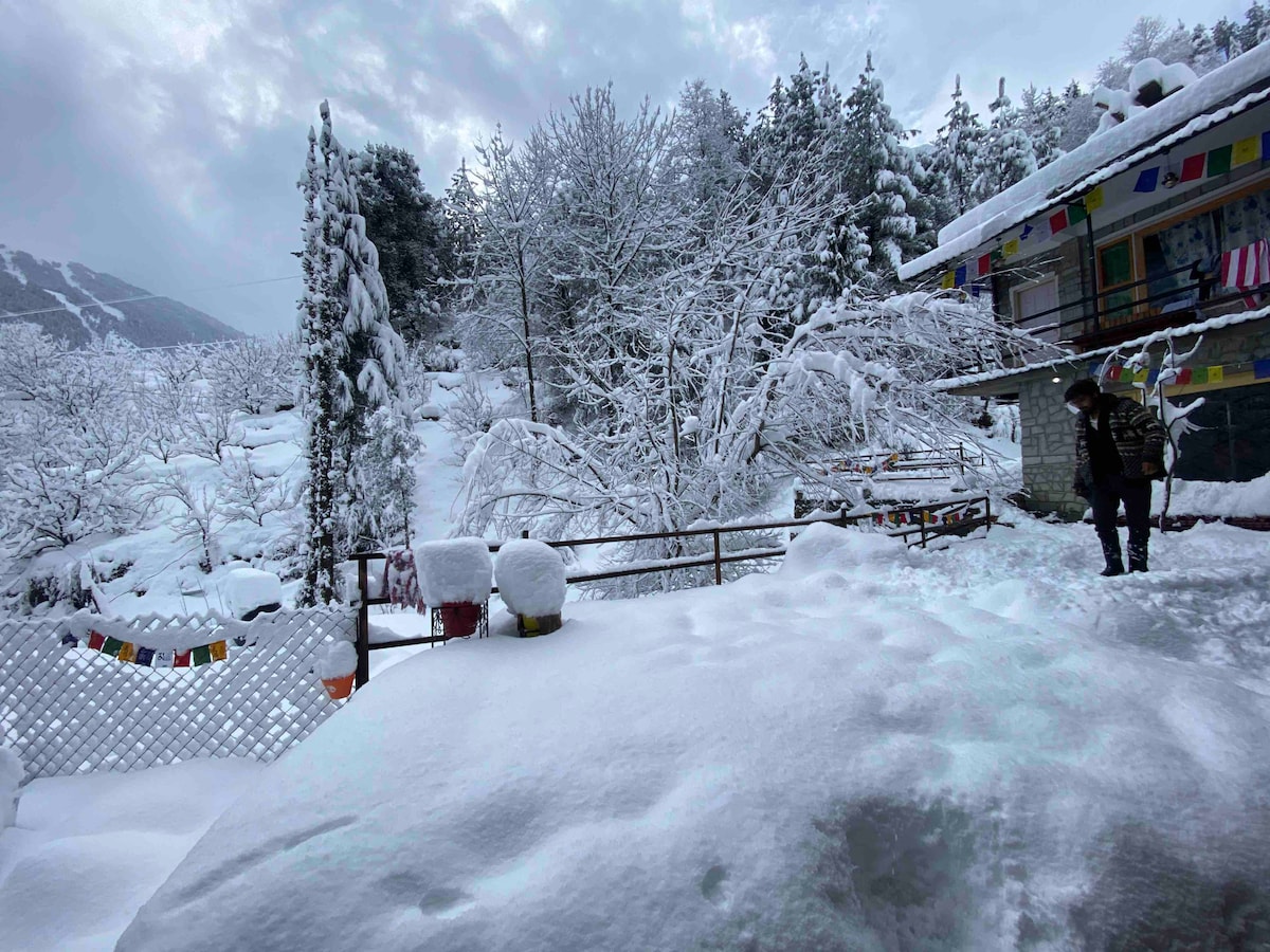 Nestled in between the snow-capped mountains, Stately Deodar Tree, Amidst Apple Orchard, and tumbling Beas River. With Jaw-dropping views property blessed with extraordinary scenic beauty. An Unbeatable Location, Just 2.5 Kms away from mall road and 800 meters from old Manali Bridge. The property also has offer to apple orchard restaurant to lounge in and a Dedicated 24*7 co-working space. Free Gated Parking Optical Fibre internet Yoga Terrace Apple Orchard Garden Dedicated Co work Space