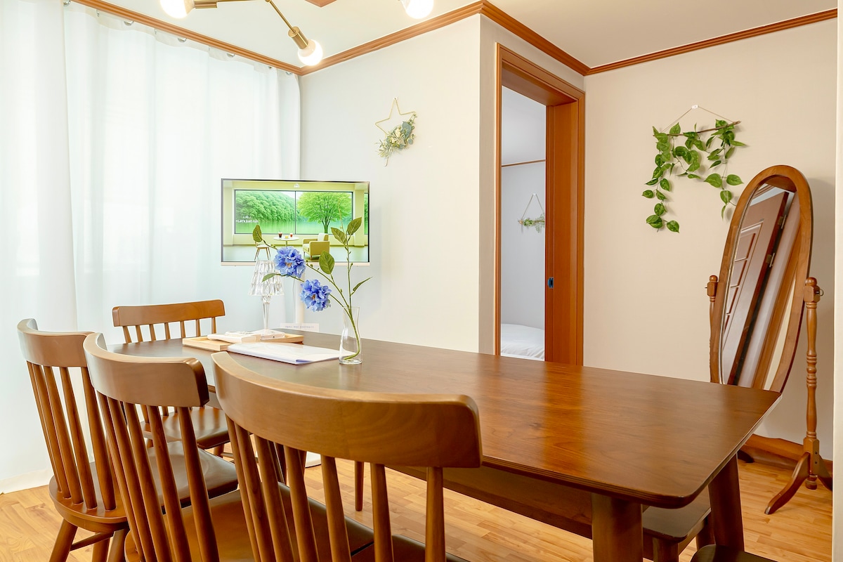 마당을 바라보며 따스한 공간에서 : ) 소중한 가족 그리고 친구들과 행복한 시간을 머물다 갈수 있길 바랍니다. 그들을 잇는 소중한 공간이길, 살아보고싶은 집이길. 행복한 시간 보내시길 바랍니다. 마음으로 만든 공간을 선물해드립니다. • 인원은 4인 기본이며, 최대인원 6인까지 가능합니다. • 체크인 오후3시 체크아웃11시 • 어메니티 드라이기 2개, 샴푸, 린스, 바디워시, 핸드워시 • 어메니티 미디어 & 기타편의 거실 쇼파 및 65인치TV & 사운드바스피커 , WIFI, 건조가능한 드럼세탁기, 닌텐도스위치 게임기 (슈퍼마리오, 동물의숲, 링피트), 시스템에어컨, 게스트 슬로우토퍼매트, 여분이불과 베개 • 어메니티 다이닝 6인용 다이닝 테이블, 여분의자, 냉장고, 전자렌지, 전기포트, 네스프레소, 식기, 수저세트 , 조리도구, 소금, 식용류, 설탕 ■ 본 숙소는 미스터멘션 특례를 적용받아 내국인 공유숙박 합법 업체로 등록되어 운영되고 있습니다. ■