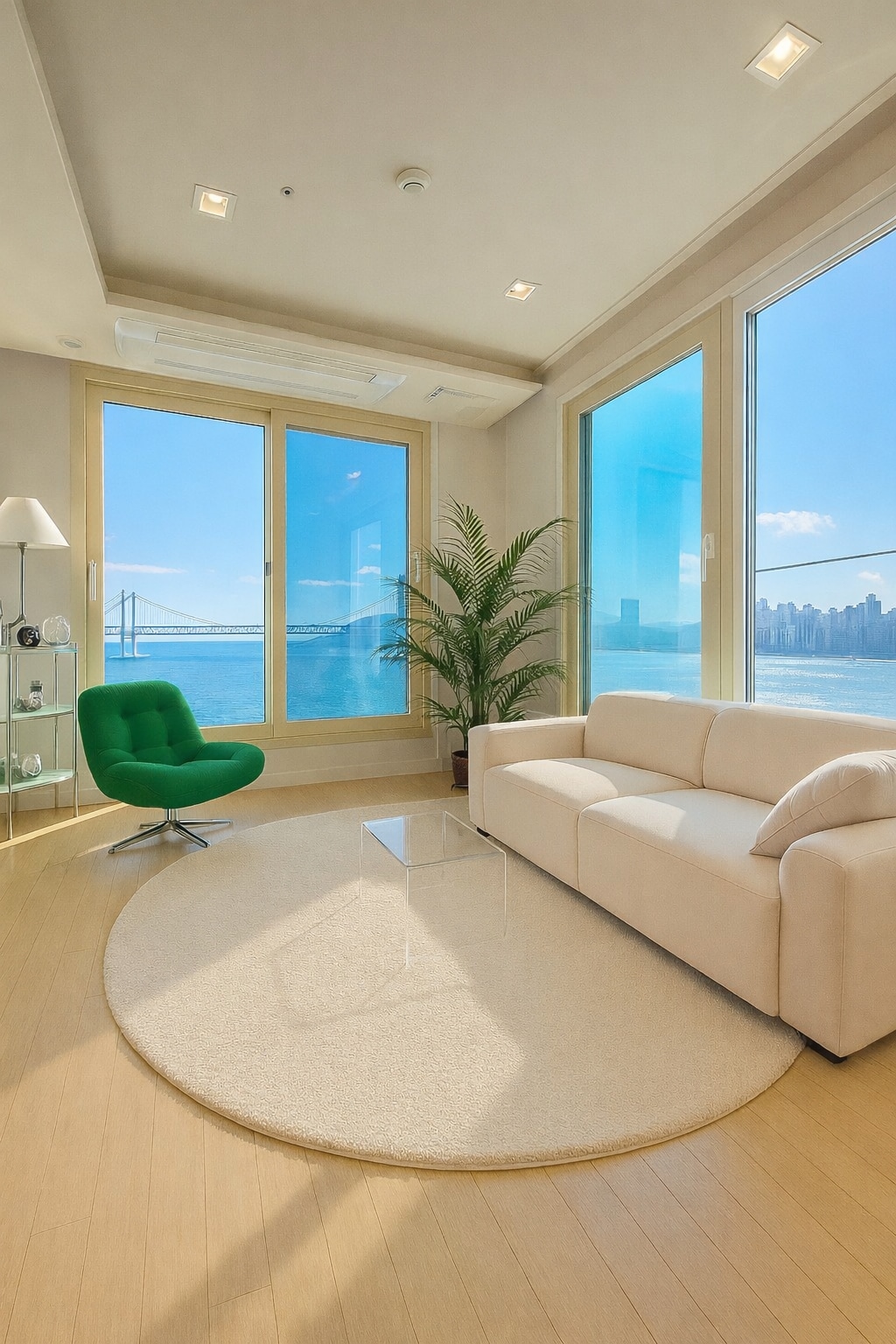 🌊 광안리 압도적 파노라마 오션뷰 ✨ 신축 프리미엄 20평 숙소 ✔ 공유숙박 합법업체 등록 ✔ 광안대교+풀 파노라마 오션뷰 ✔ 광안리 유일무이 무료주차 문 열자마자 “와!” 하는 감탄 1등 숙소예요🤍 가족/우정/커플 여행 모두 만족도 200%! 🛏 최대 7인(퀸 6인 + 엑스트라베드 1인) 퀸침대 3개, 슈퍼싱글침대 1개 총 3대 에어컨(거실+방2) 암막커튼 & 무드등 🌊 오션뷰 특권 거실&안방에서 광안대교·일출·야경·불꽃축제직관✨ 소파에 앉아 파노라마오션뷰 감상 🚗 위치 & 편의시설 밀락더마켓 도보 30초, 편의점 1초, 광안리 해변, 횟집, 식당, 카페, 지하 3개층 무료주차 🕒 체크인 16:00 / 체크아웃 11:00 🎉 오픈 이벤트 ✔ 얼리체크인(1시간) ✔ 레이트체크아웃(1시간) ✔ 체크인 전 짐 보관 가능 위 3가지 중 하나만 선택하신 후 호스트에게 사전 문의 주세요.(체크인 전 미리 협의시에만 도와드릴 수 있어요.)🥰 편하게 문의주세요! 🙌