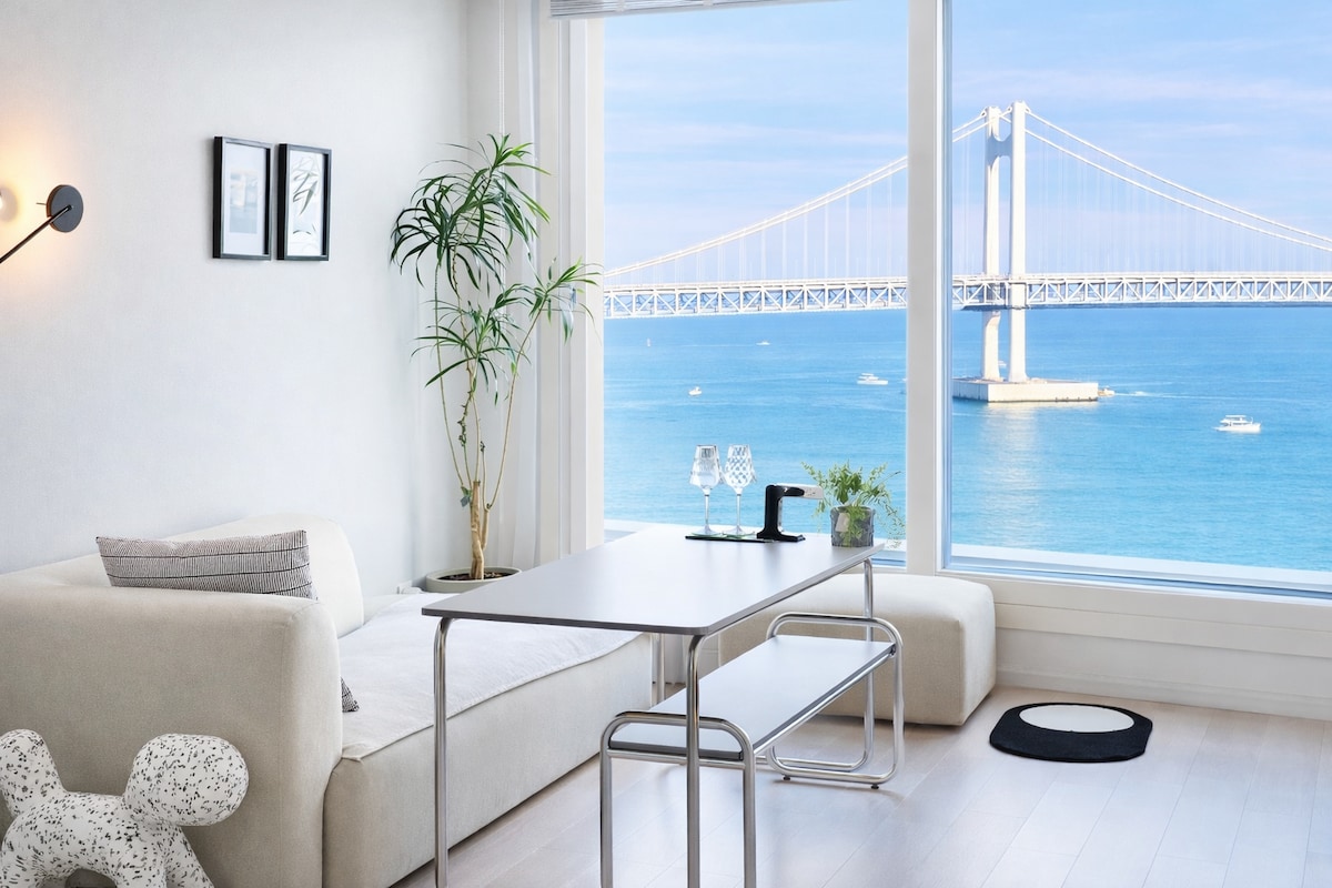 ❤️최근 방 확장 공사를 하여 침실 2개, 거실 1개의 구조로 퀸 침대 1개, 더블 침대 2개로 여유있게 주무실수 있어요:) 안리빌라(Anri villa)를 찾아주셔서 감사합니다. 🎇초근접 광안대교를 볼 수 있는 환상적인 브릿지 뷰(full ocean view) 💕거실과 침실 모두에서 볼 수 있는 힐링 풀오션뷰와 광안대교뷰 "인생샷을 남겨보세요"💖 신축 20평형대 프리미엄급 숙소로👍 매일 침구류 세탁과 살균소독 및 청소, 청결을 최우선으로 합니다.😉🎇 🍃숙소 건물내 지하1~3층 무료 주차장(자주식) 🍃스마트TV로 넷플릭스 유튜브 등을 즐겨보세요. 🍃바로 옆 밀락더마켓, 해운대 차로 10분 거리 🍃1층 카페, 와인샵 등 편의시설이 있어요. 🍃🍃 안티스트레스 티(유기농)와 핸드드립 커피, 인센스가 준비되어 있습니다. 마음이 복잡했다면 따뜻한 차와 향과 함께 조금은 해소되길 바라요.