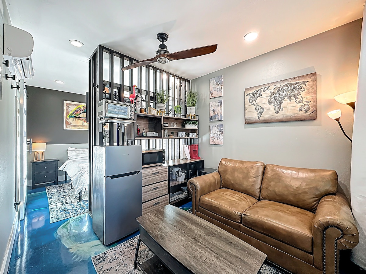 Newly Remodeled stylish and private studio suite with queen bed, bathroom, living/dining/work area, kitchenette (Dry), and shared laundry in the trendy Old Seminole Heights neighborhood. With an 83/100 walk score its easy to visit bars, restaurants, diners, bakeries, and quaint shops, or stroll the tree-lined streets of 100+ year old houses. This spot is perfect for the Tampa explorer with easy access to downtown. Free street parking, free WiFi, free shared laundry (in adjacent space).