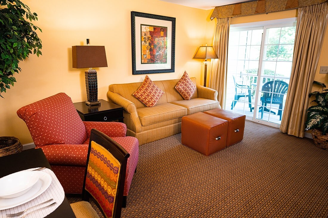 Everything needed for a memorable getaway to historic Williamsburg is right here. Take advantage of on-site recreation and endless amenities in a picturesque setting. The well-manicured lawns and pristine lakes make a lovely retreat after a day of adventuring in Colonial Williamsburg. This suite includes a King bed, and a Queen sleeper sofa in the main living area.