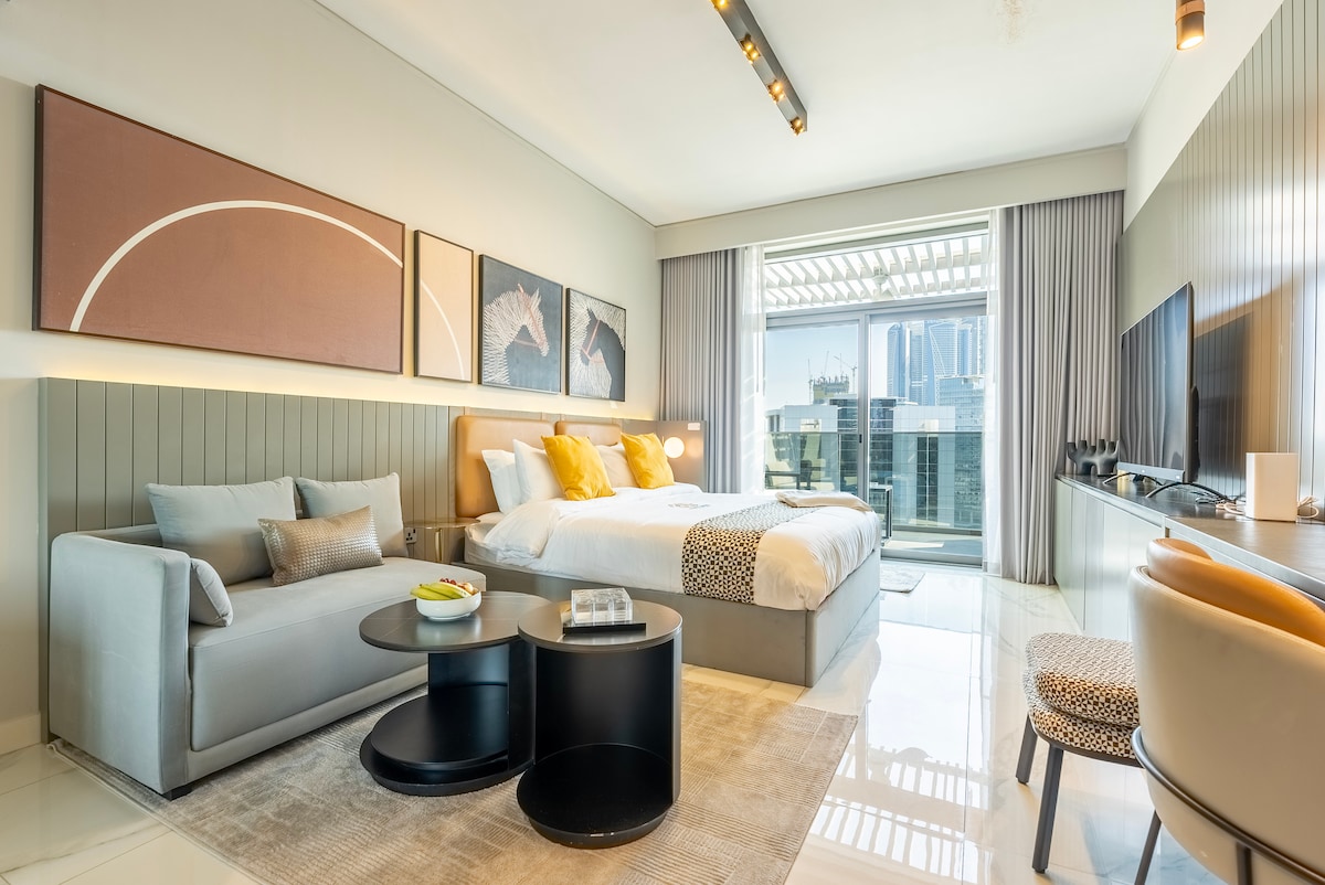 Welcome to your Boutique studio in Business Bay, where modern comfort meets urban convenience. Start your day with freshly brewed specialty coffee from the bean-to-cup coffee machine while enjoying the the central landscape. The studio features a cozy king-sized bed, a sleek kitchenette, and a modern bathroom. For added convenience, grab fresh pastries from Maison Cafe downstairs. Perfect for a relaxing and unforgettable Dubai stay. Book Your Stay Now!