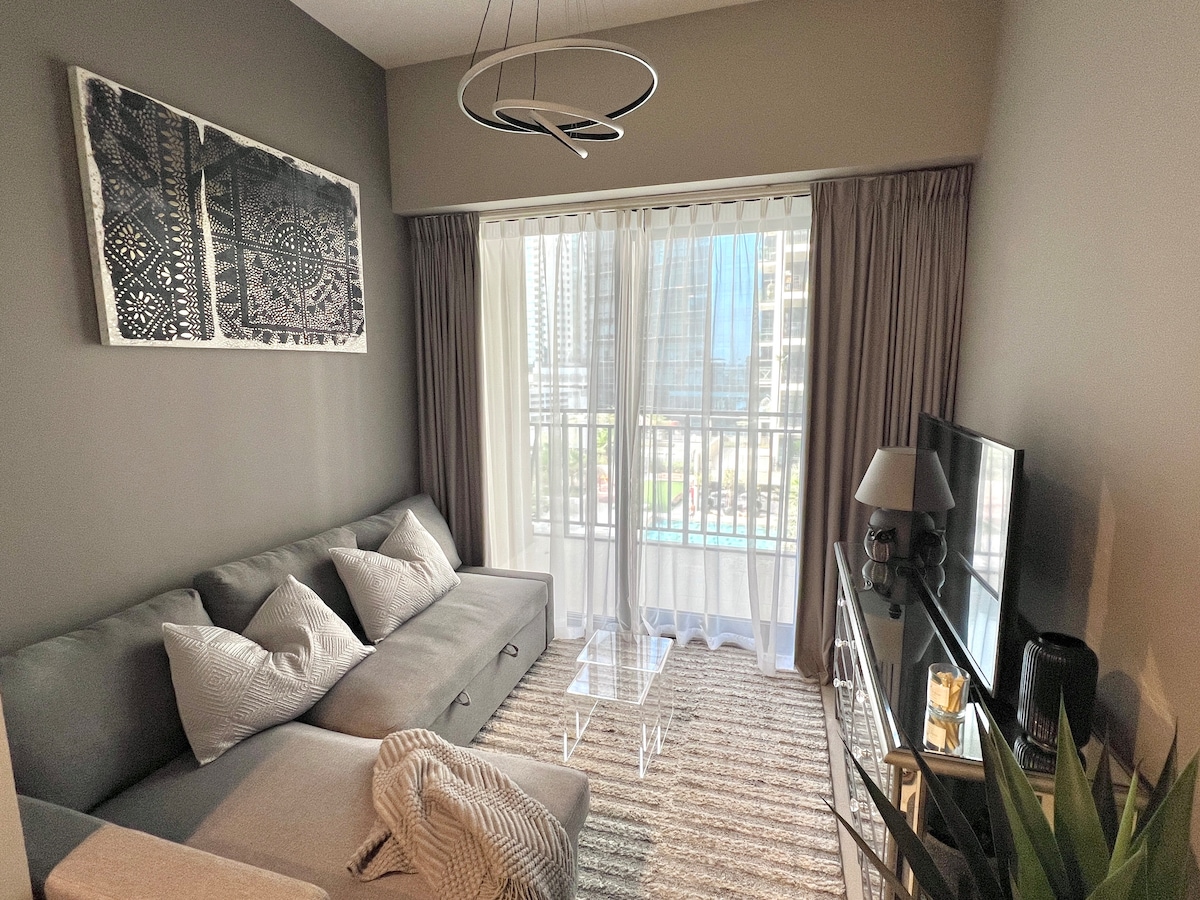 Welcome to Cloud 18 Studio Apartment at Ahad Residences, Business Bay. Step into your bright, fully furnished with wooden Interiors that feels you calm and relaxation featuring a plush queen-size bed and a comfortable single sofa bed—perfect for solo travelers, couples, or small families. The clean, minimalist décor and floor-to-ceiling windows flood the space with light and offer sweeping views of the Business Bay skyline and glimpses of architectural landmarks.