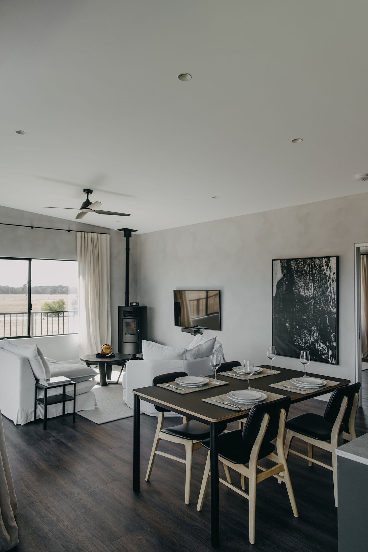 If a place was an exhale, this would be it. The space was created with slow & sustainable living in mind, giving you space to breathe & time to truly switch off. The Lookout sits in an open paddock, with 360 views of farmland. Take it all in from your bathtub or through huge windows that frame views stretching right over the wilds of Wildwood. Inside is a cocooning embrace; it’s the dreamiest sanctuary for two. Unfortunately our property is not set up to host newborns, infants or toddlers.