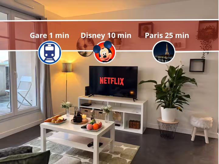 Venez découvrir Disneyland et Paris en séjournant dans notre bel appartement de 40m², parfait pour 4 personnes et un bébé. Idéalement situé au pied de la gare (à 20 mètres), vous bénéficierez d'un emplacement exceptionnel avec : À 1 minute de la station RER A. À 8 minutes de Disneyland en RER. À 5 minutes de la Vallée Village (shopping de luxe) en RER. À 5 minutes du centre commercial Val d’Europe (shopping, restaurants, cinéma...) en RER. À 2 minutes du supermarché, boulangerie, restaurants...