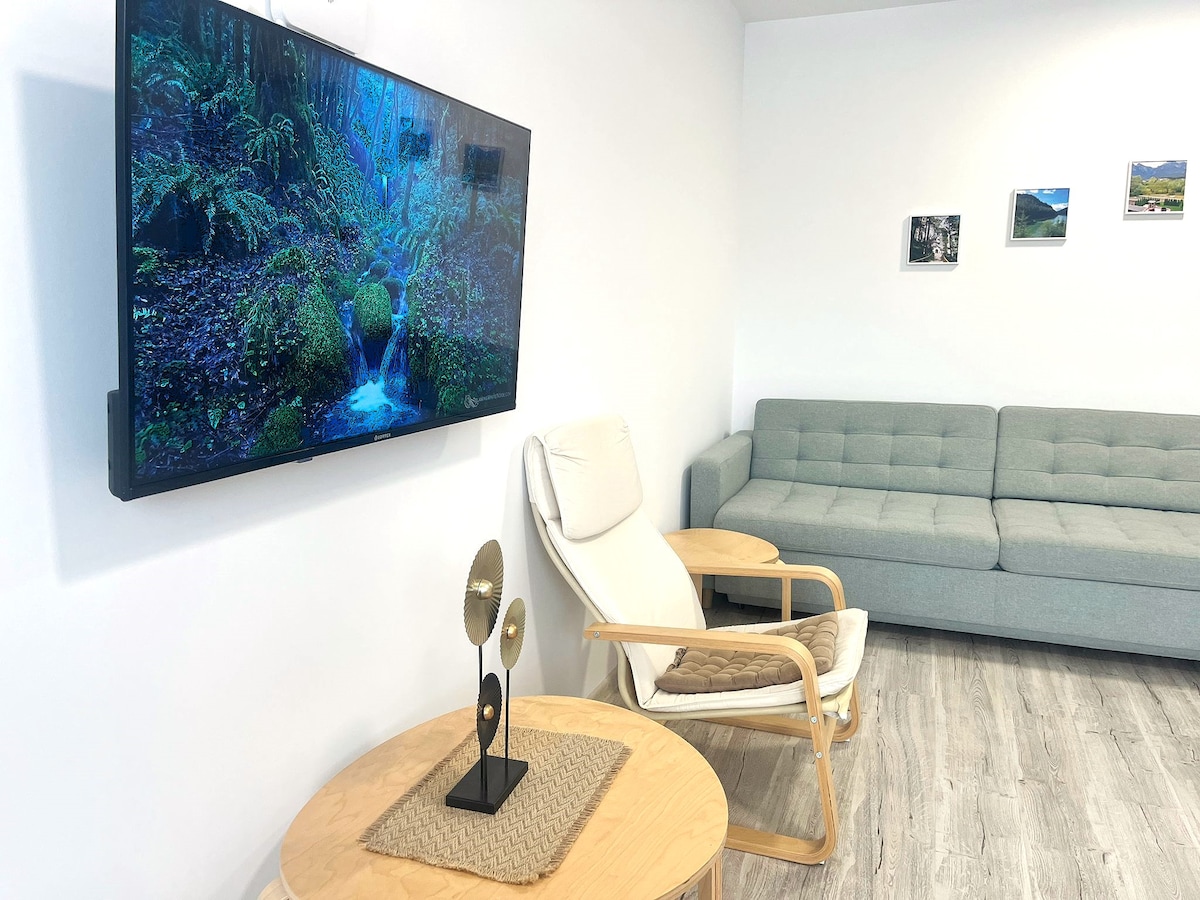 Key points of our retreat: - Spacious Living: Generously sized living areas. - Fully Equipped Kitchen: Cook up a storm with all the kitchen utensils and appliances you need at your fingertips. - Private Terrace: Savor your morning coffee or evening wine on our beautiful terrace, overlooking the mountains. - Self Check-In: Enjoy the convenience of flexible, self check-in at any time of the day. - Thoroughly Disinfected: Our apartment is professionally cleaned and disinfected after each