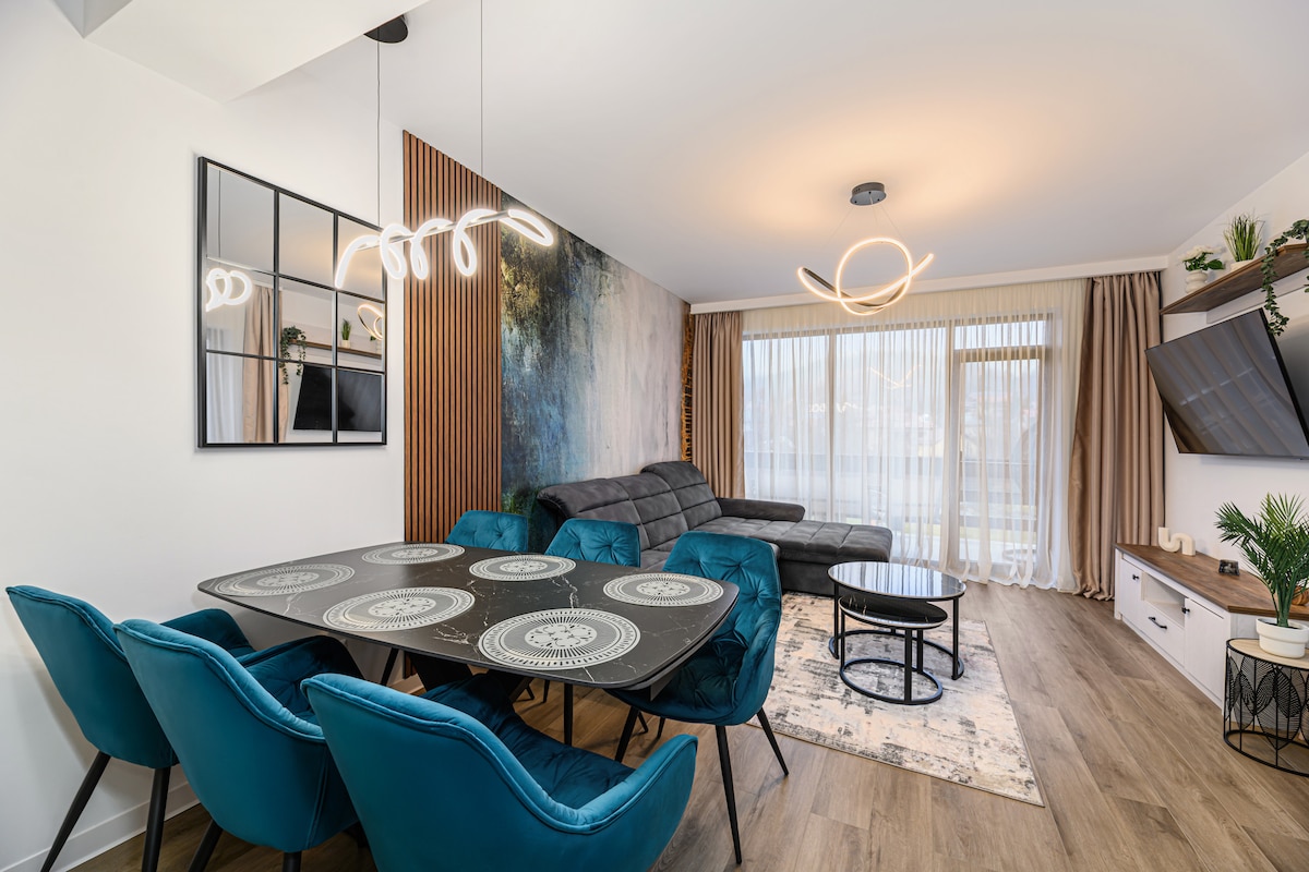 Welcome to Riverside Lindas Apartment, an elegant home by the river. This meticulously designed apartment features two stylish bedrooms adorned with a refined aesthetic and soft neutral tones. Enjoy your favorite shows on the smart TV, and gather at the dining table in the open-concept kitchen, featuring an espresso machine and modern induction stove. Step out onto the balcony to savor breathtaking views of the Prahova river and Bucegi mountains. Experience sophistication in every detail!