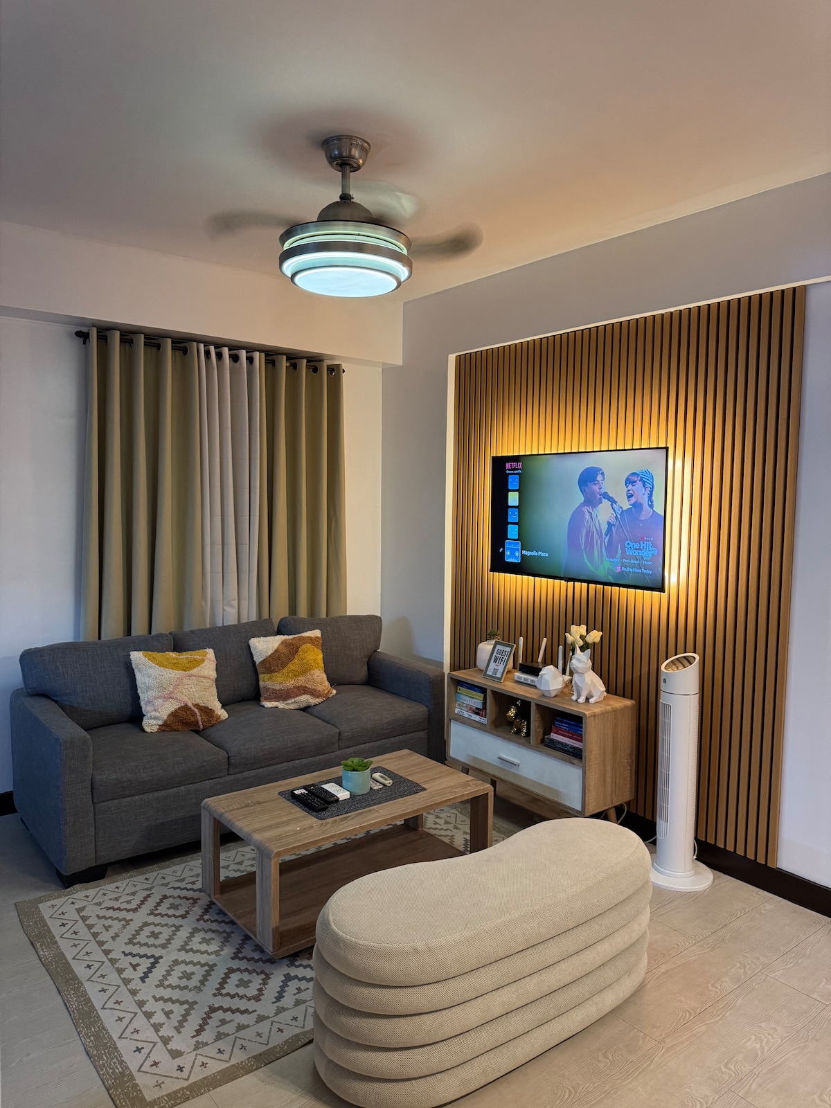 This unique place has a style all its own. Feel the NATURAL, WARM & COMFORT ambiance of my flat situatd in the heart of CONG. TOWN CTR. COND., qc. Standard clean, well kept, sanitize flat & fresh premium linens & 6 fluffy pillows. RELAXING and comfrtable QUEEN size orthopedc bed wth premium MEMORY foam topper. Fully furnishd flat wth appliances: 🔹karaoke w/ 2 mic 🔸49" smart tv wth premium netflix acct. 🔹1.5hp new aircon unit wth remote control 🔸unli wf installed 🔹hot/cold shower