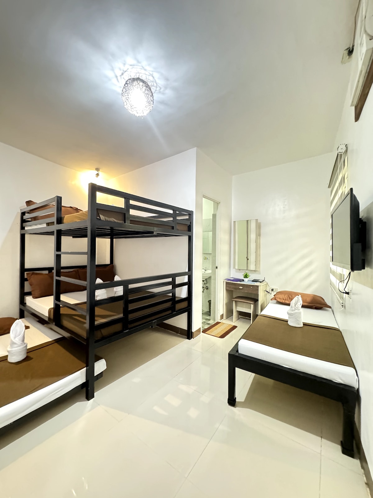 Room amenities: -Air conditioned room -Fresh Sheets and Towels -Shared Toilet and Bath (bunk bed room good for 4 person) -Hot and Cold Shower -Individual Bed lights -Individual Power Sockets -Fast WIFI in room and the entire property
