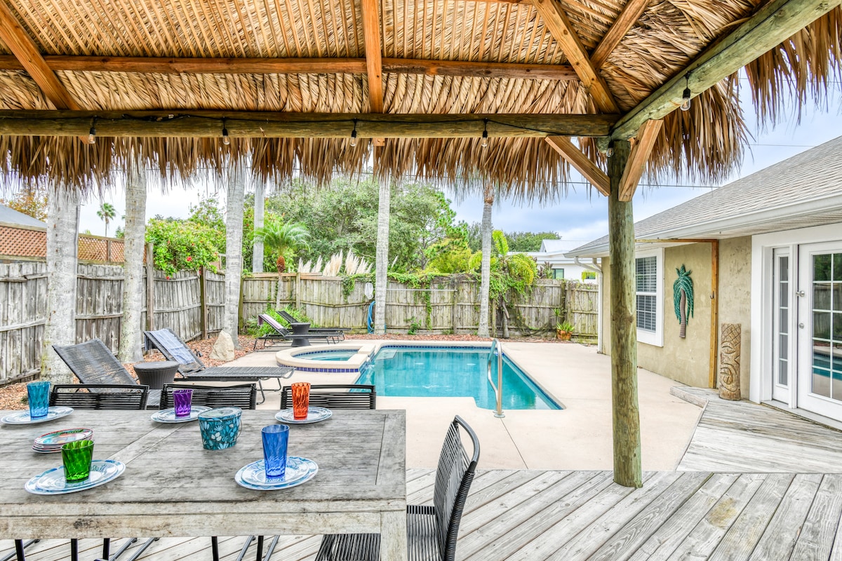 This getaway is nestled on the "island" in a quiet residential neighborhood, with small touches of Hawaiian decor. ~ Just a 2min drive to the closest beach entrance, or a 12min walk. ~ Private heated pool (up to 85) + hot tub ~ Large backyard with marsh front view ~ 15 -20min drive to historic downtown ~ 11min drive to the St Augustine Pier ~ 13min drive to Marineland ~ 17min drive to Washington Oaks Gardens State Park ~ 7min drive to Publix or Winn Dixie