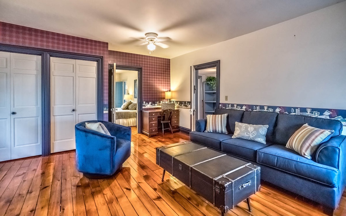 Luxurious and spacious suite with comfy King Bed, WIFI, Attached Living Room with queen sleeper sofa and two arm chairs and private bath with clawfoot tub/shower. 43 Inch Roku Smart TV in the bedroom and additional TV in living room. This suite is situated on the second floor of a beautiful historic home. At the top of a grand staircase your private suite awaits. Just one block of Main street this home is walking distance to restaurants, breweries, shopping, and museums.