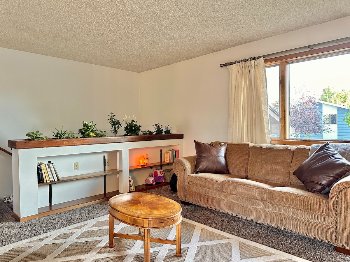 We have changed our listing to month or longer stays and encourage people to advantage of the good rates this allows. Father Sheehan Park is close for creek side “socially distant” walks. Other changes: living room sofa no longer a bed, 2 twin beds in loft, Solo fire pit, removed play set. Open plan, no door on bedroom. Located in a quiet neighborhood yet within a half-mile of shopping, and one block away from a park and trails along Blacktail Creek. Looking forward to your stay!