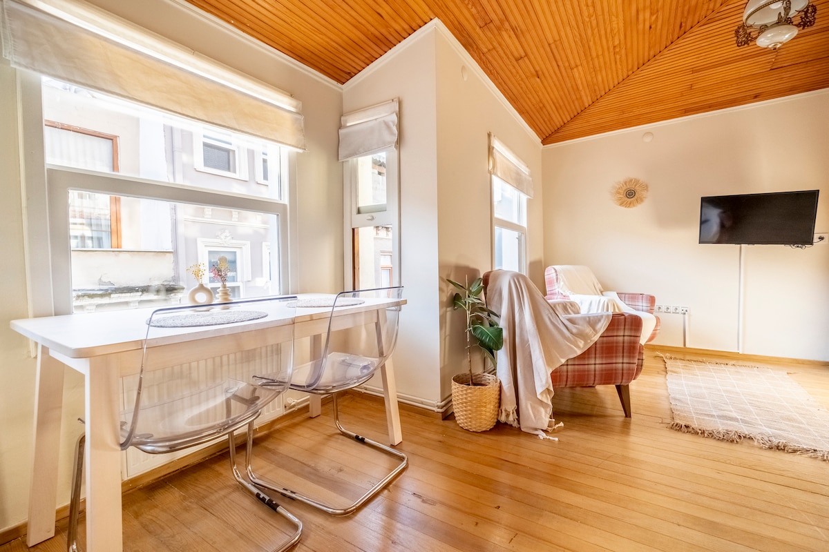 Our newly renovated 140+ years old apartment is located 200 meters away from the Galata Tower. There are two bedrooms, 1 living room, 1 fully equipped kitchen and a bathroom. Each room has airconditioner. The flat is on the 3rd floor and can accommodate up to 5 people. The building and the flat itself maintain it's magical 19th century spirit. We wanted to offer our guests a historical atmosphere in a modern design in top location.