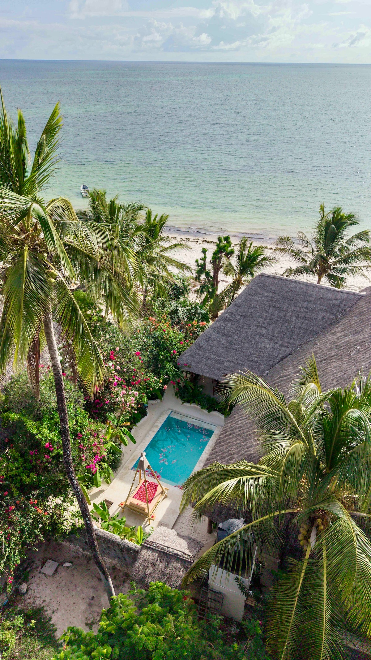 The house offers a perfect spot at the front line of the beach with a panoramic view of all the beautiful sand and sea of Jambiani, but with the additional benefit of feeling the privacy of a home because of its unique position. The garden is at the front, with cosy places to have lunch, lie down and watch sunrise; and the house backwards, full of simple corners to enjoy.