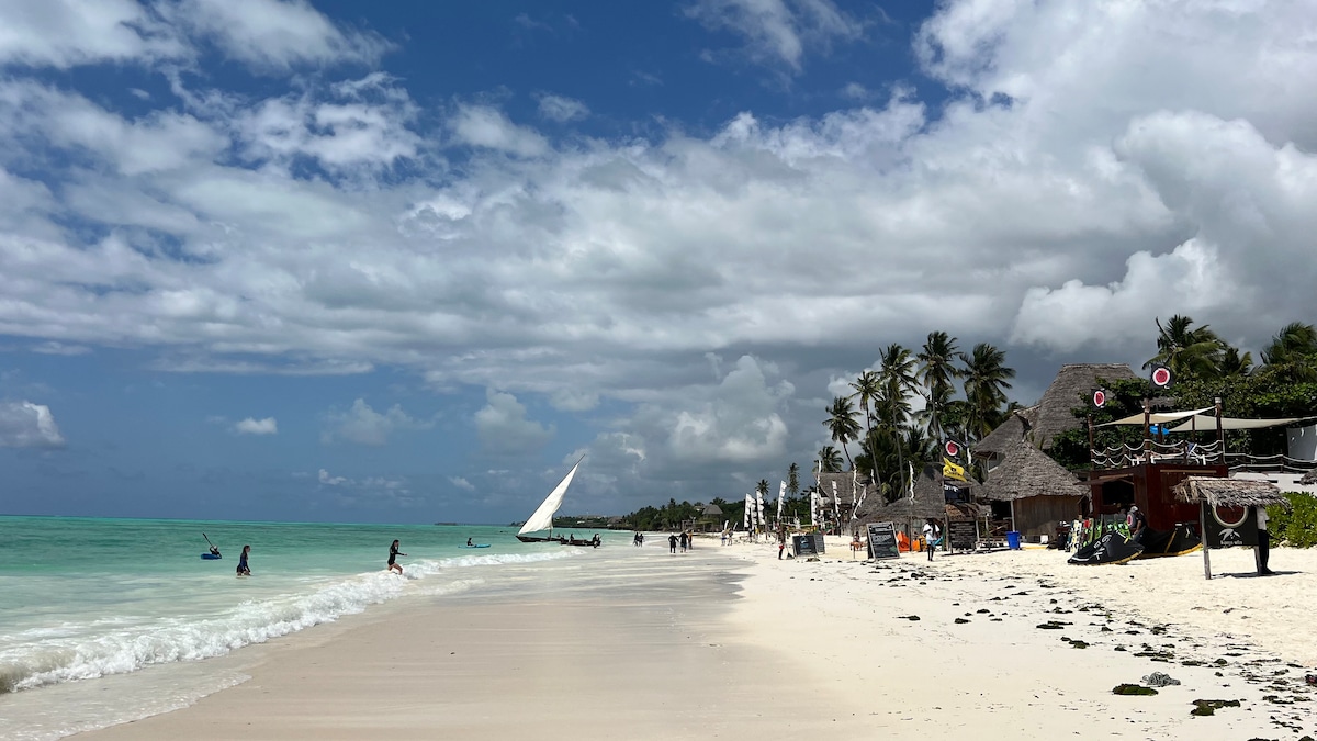 Just a few steps away from the Indian Ocean! UHURU top floor apartment, super king size bed and sofa bed in living room. Fully equipped kitchen, dining/living area. Situated in Jambiani Mfumbwi with the most beautiful turquoise water you ever seen. TV with Netflix access, AC rooms, Fast Wi-Fi, daily housekeeping, private parking, terrace and security, safe box, Iron and boards, hair dryer. There is no such a place like this in whole Zanzibar! Private roof top terrace with sun set/sun rise view