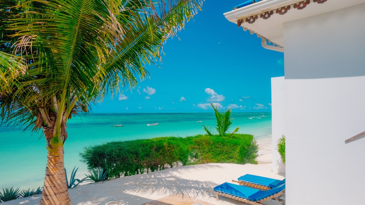 Karibu to our Dolphin Paradise Dream Villa, directly on beautiful Jambiani beach, with breathtaking views of the turquoise Indian Ocean. Come, unwind, play, relax, and dream with family or friends. The house offers 3 bedrooms, 3 bathrooms, a living room, a fully equipped entertainment kitchen, a private beach and pool, and a huge shaded outside beach lounge. In a quiet area, close to many restaurants, bars, and kitespots in Jambiani or Paje. Wake up and fall asleep to the sounds of the ocean.