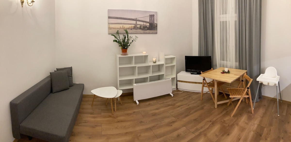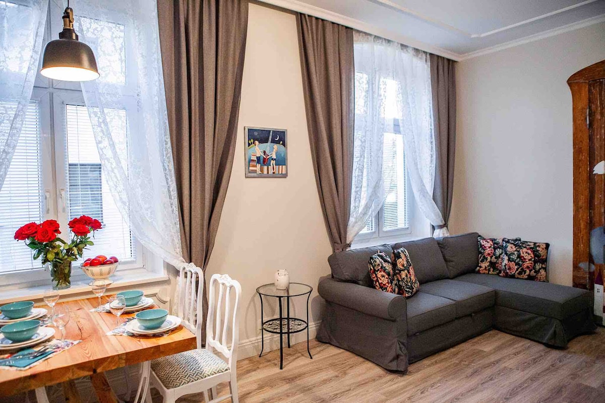 An elegant, comfortable vintage-style apartment in the very center. A comfortable bed, a bathroom with a shower, a well-equipped kitchenette with a dining area and a work space, a beautiful living room with armchairs and a comfortable sofa and FAST WiFi is the perfect solution for business or tourist travelers looking for the comfort of a good hotel, and at the same time independence. The apartment is located on the most representative street of Bydgoszcz. Right next to a beautiful park.