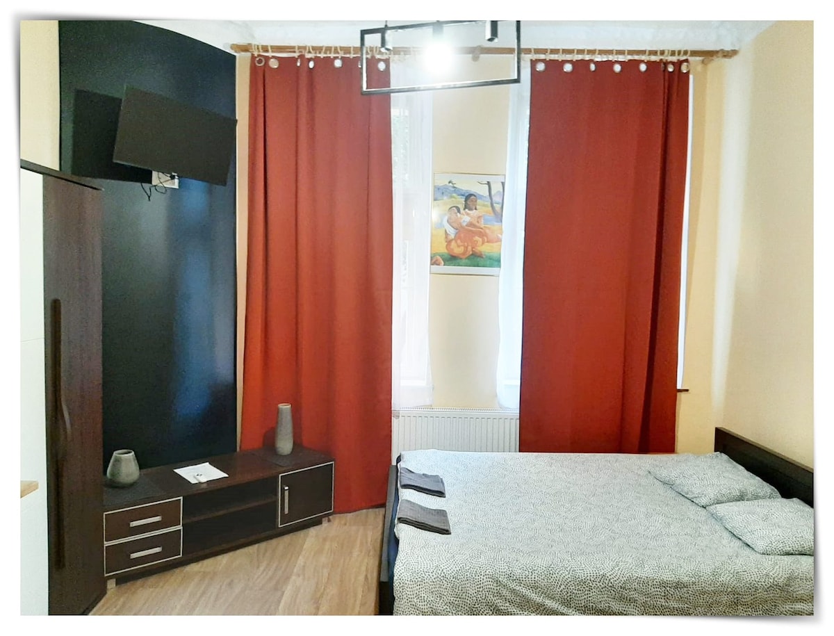 Nasz przytulny apartament znajduje się w zrewitalizowanej kamienicy na 3 piętrze. Jest po kompleksowym remoncie, w apartamencie znajduje się więc wszystko czego potrzeba gościom. Poza przestronnym wnętrzem salonu, do dyspozycji jest korytarzyk z zabudowaną szafą. Ponadto bogato wyposażony aneks kuchenny. Znajdziecie tu Państwo też niezbędne sprzęty. Na uwagę zasługuje drewniana podłoga oraz balkon z kutą balustradą. W oknach znajdują sie rolety. Parking płatny tylko 8-17, w weekend bezpłatny.