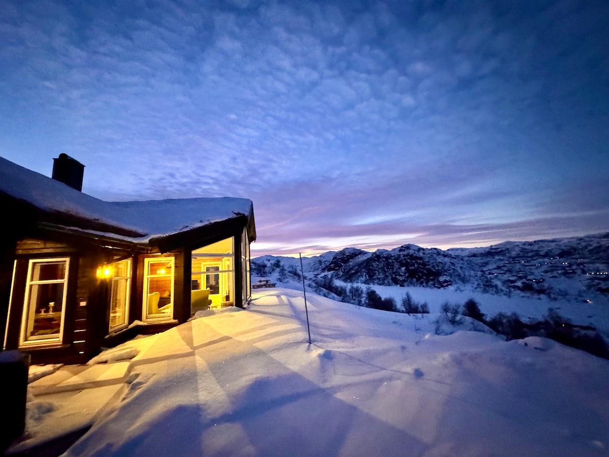 Hytte fra 2021. Fantastisk utsikt som tas med inn i hytta via vinduer fra gulv til tak. Du får derfor naturen tett på. På sommeren beiter sauene rundt hytten og hare kan du ofte se tidlig på morgenen. Varmepumpe og peis som gir en god varme i hytten. Egen loftstue hvor døren kan lukkes. Supert for ungene å leke med mye plass på gulvet. Her finner dere TV, lego, puslespill, brettspill. Hytten passer fint for to familier. 10 sengeplasser. Hvis man bare er voksne anbefales Max 8 personer.