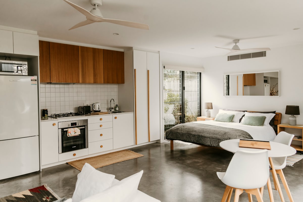 Set in a leafy cul-de-sac street in Byron Bay, the studio offers a sense of calm while still being conveniently close to everything. Byron’s town centre and iconic beaches are just a 2-minute drive or a brisk 15-minute walk (20-minute stroll). Take-away coffee and pastries are available in the morning from the Sunseeker coffee caravan which is situated at the top of the street, and the relaxing Byron Bathhouse is a 2-minute walk away for those wanting to unwind even further.
