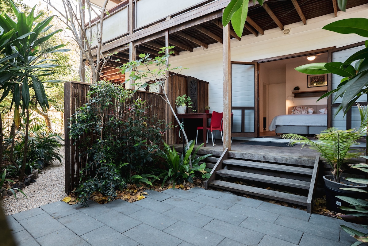 From the moment you step through the gate, you feel the relaxed Byron vibe! It's a 2 min walk to Baz & Shaz's 'pantry', 7 mins to Suffolk village, and 15 mins to Tallow Beach. The centre of bustling Byron is a 10 min drive. The Suite has a king-sized dbl bed, ensuite, private entry, private verandah and courtyard with table and chairs, and a desk in a nook. There's a kitchen cupboard with a microwave, bar fridge, toaster, kettle and crockery suitable for breakfasts and managing takeaway.