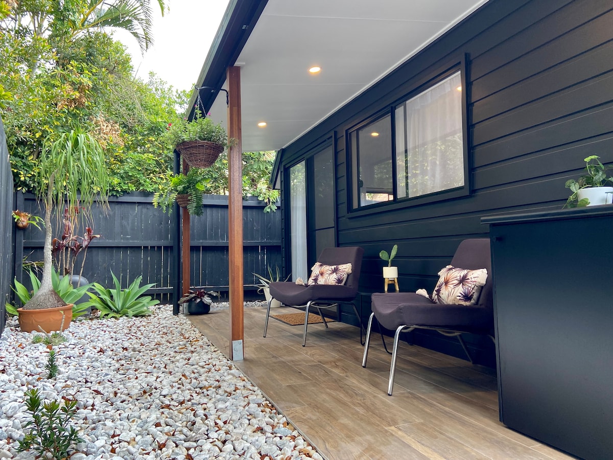 Modern new studio opposite Belongil Beach with a short 10 minute walk to town and a 3 minute walk to the famous Treehouse restaurant and bar. The studio has a separate entrance from the main house. The kitchen has a full fridge, hot plate, microwave ( located in cupboard above the fridge) and air fryer. There is mini weber bbq for guest use. This cabin has everything you need for a lovely seaside break including aircon and a fan.
