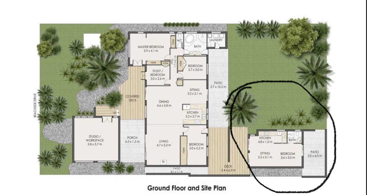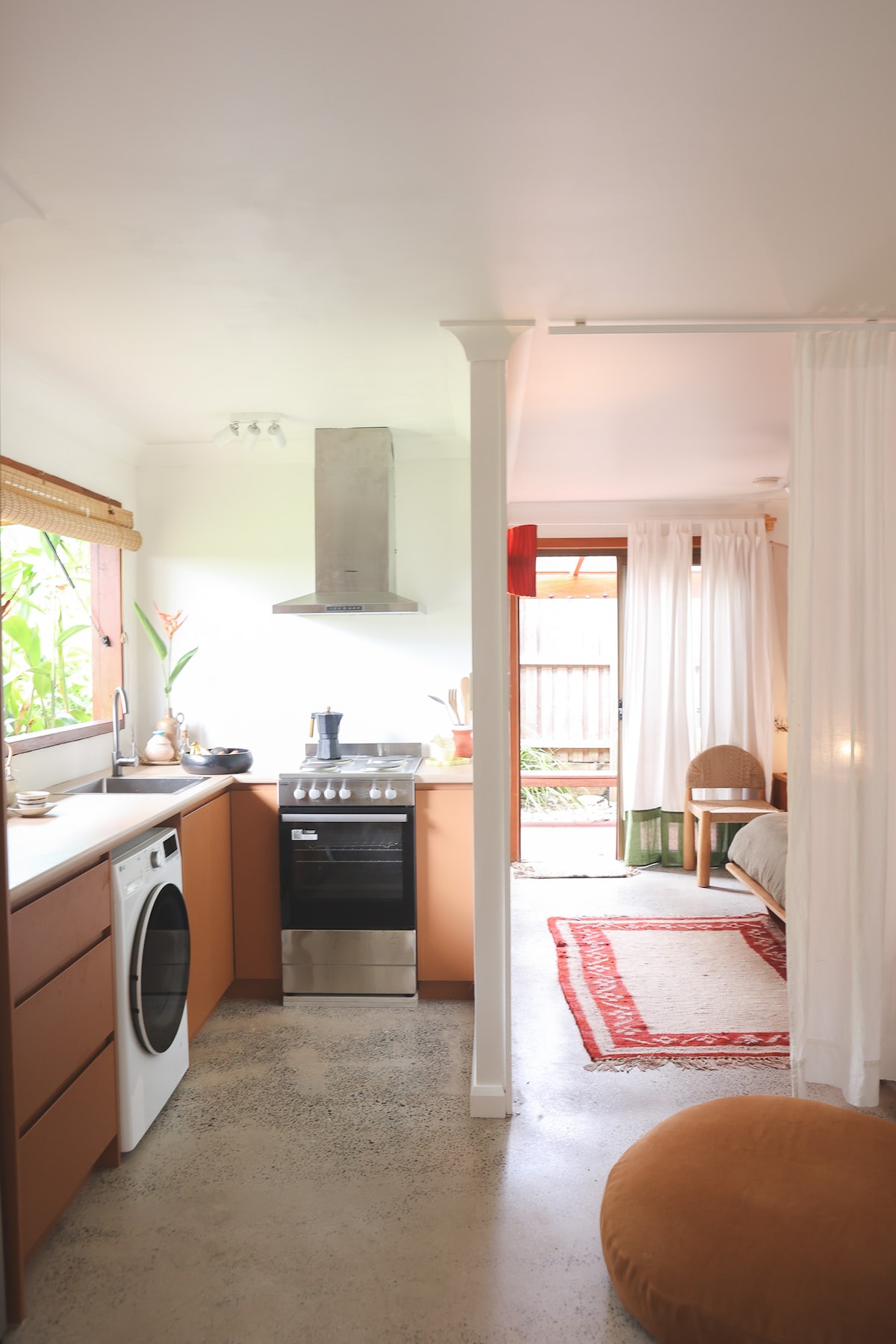 Modern new studio opposite Belongil Beach with a short 10 minute walk to town and a 3 minute walk to the famous Treehouse restaurant and bar. The studio has a separate entrance from the main house. The kitchen has a full fridge, hot plate, microwave ( located in cupboard above the fridge) and air fryer. There is mini weber bbq for guest use. This cabin has everything you need for a lovely seaside break including aircon and a fan.
