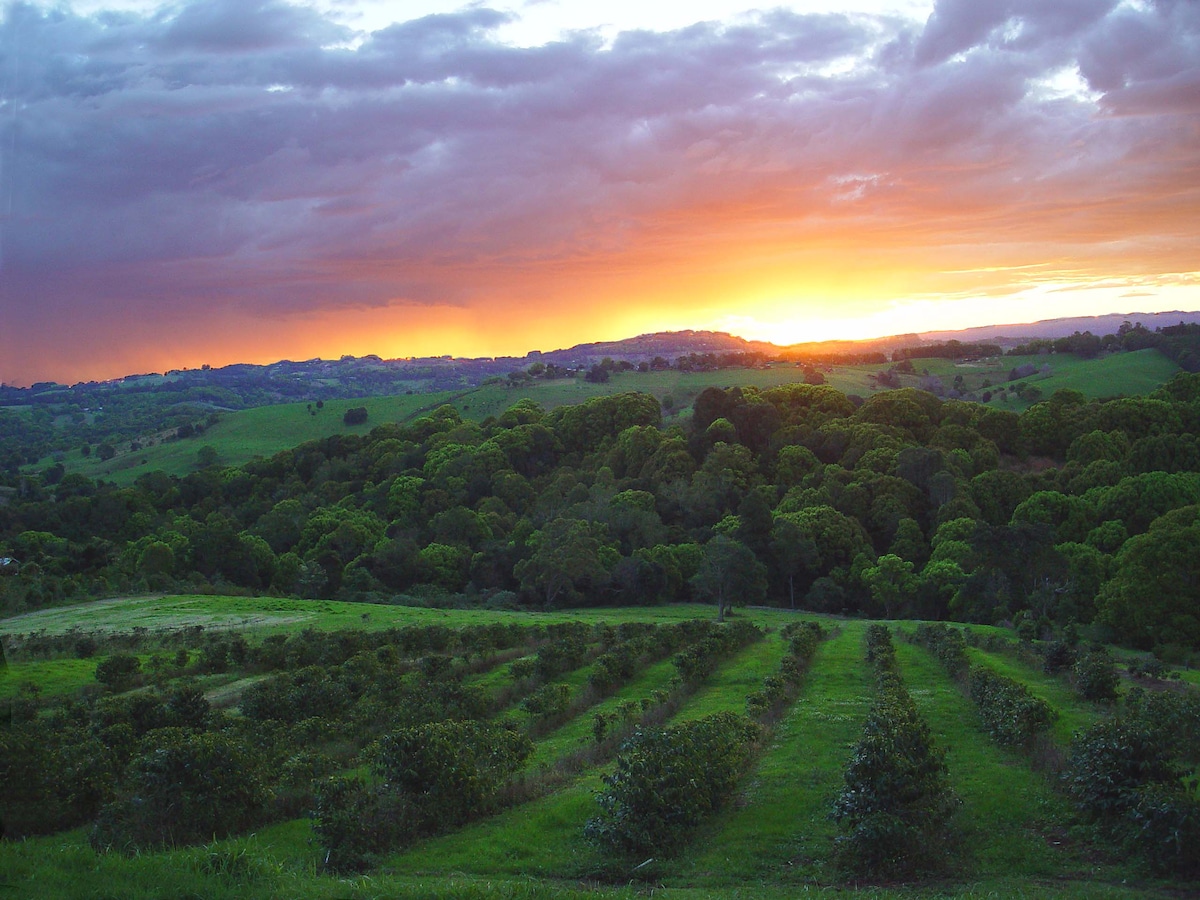 Breathtaking 270 degree distant views from sunrise to sunset. A newly built, self-contained eco villa, on a working cattle farm, providing stunning vistas of Byron Bay Hinterland from your bed! Natural lime-rendered hempcrete walls, rustic hardwood beams, & timber floors. Open plan with floor-to-ceiling glass. French doors in the bedroom open to the claw foot bath on the deck. Easy driving distance from Mullumbimby, Byron Bay, Brunswick Heads, Ballina airport and Coolangatta / Gold Coast.
