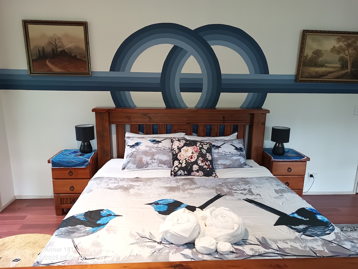 An extra large self contained studio space with woodfire heating. fan, screens, smart TV , stove, microwave, toaster, kettle, sink, access to shared bathroom with large spa bath, laundry, WIFi, abundant wildlife, peaceful and serene views of waterfalls and lush raibforest valley.nearby creek. Note: our place sits in a natural spot with occasional wildlife visitors—think huntsman spiders and, rarely, snakes—right by the outdoor toilet. If those give you the jitters, this might not be your stay.