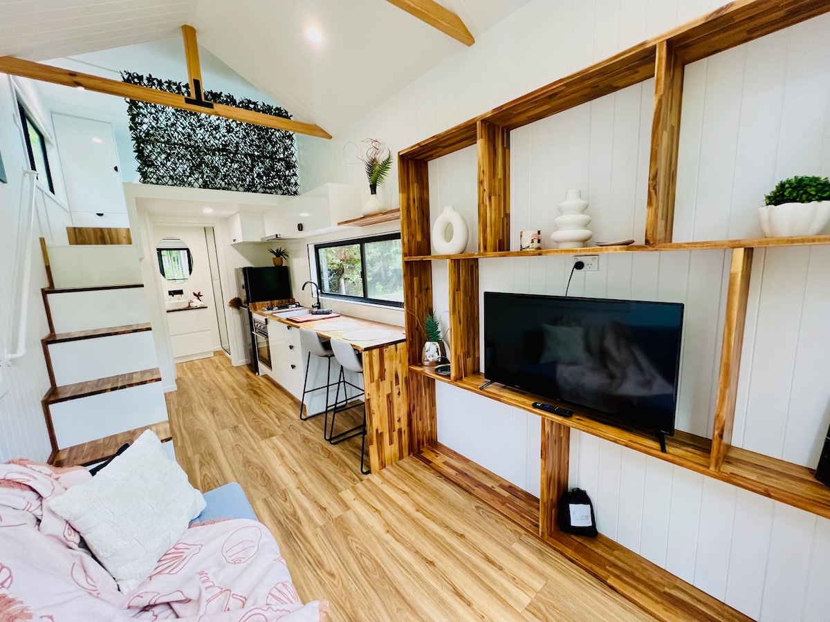 Indulge your senses in this breathtaking Tiny Home on a beautiful oasis. Brunswick river frontage & your own Swimming hole. A special rare sanctuary not to be missed. La kookaburra has all the luxuries & skylight to fall asleep staring at the stars above. A fire pit & views of the Waterfall at Nightcap Ranges, you're senses will be in overdrive. Just 8 mins to Mullumbimby & 10 mins to Byron Bay - Platters available on request. Immerse yourself in Nature. Namaste