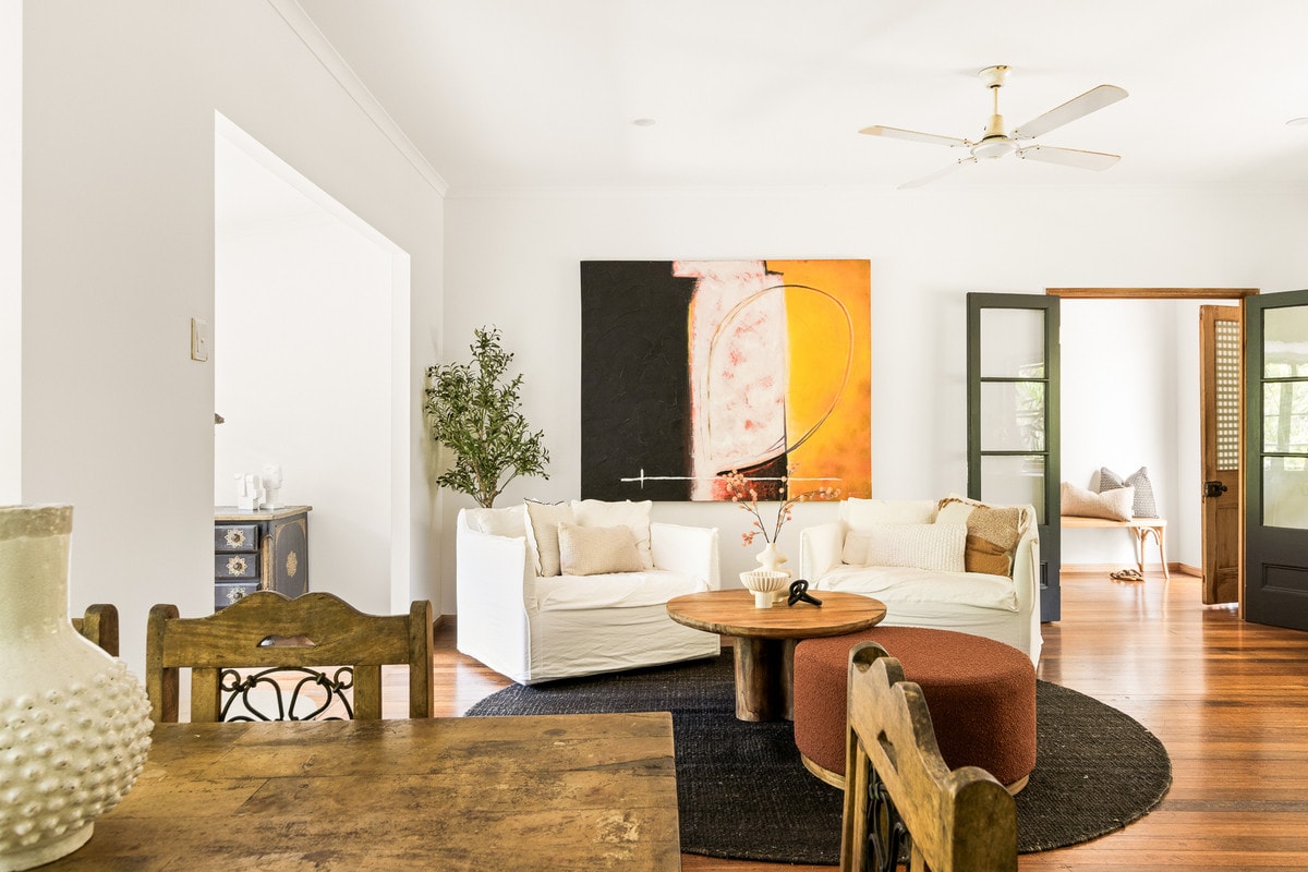This beautifully restored 1880s cottage with a modern barn-style extension features a wraparound verandah with hanging swing, french doors off four light-filled double bedrooms, french linen bedding, magnesium pool, sauna, and lush gardens. Located in peaceful Bangalow town, it’s ideal for a relaxing stay or creative retreat. Walk to town, unwind in comfort, and enjoy the warmth and charm of this soulful, design-led home. Note the upstairs lounge area with queen sofa bed is open plan.