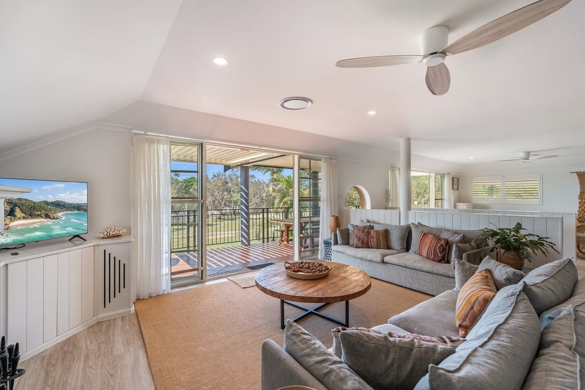 Just 5 minutes from the idyllic hinterland town of Bangalow & 15 minutes from the pristine beaches of Byron Bay, The Hut Guesthouse is a luxurious 6 bedroom, 4 bathroom home with a private cinema, billiard room, swimming pool, wood-fired pizza oven, outdoor BBQ area & on-site restaurant offering unique in-house dining experiences. With sweeping wraparound views, the Guesthouse is situated on 2 acres of cascading lawns and lush rainforest leading down to your own private section of Possum Creek.