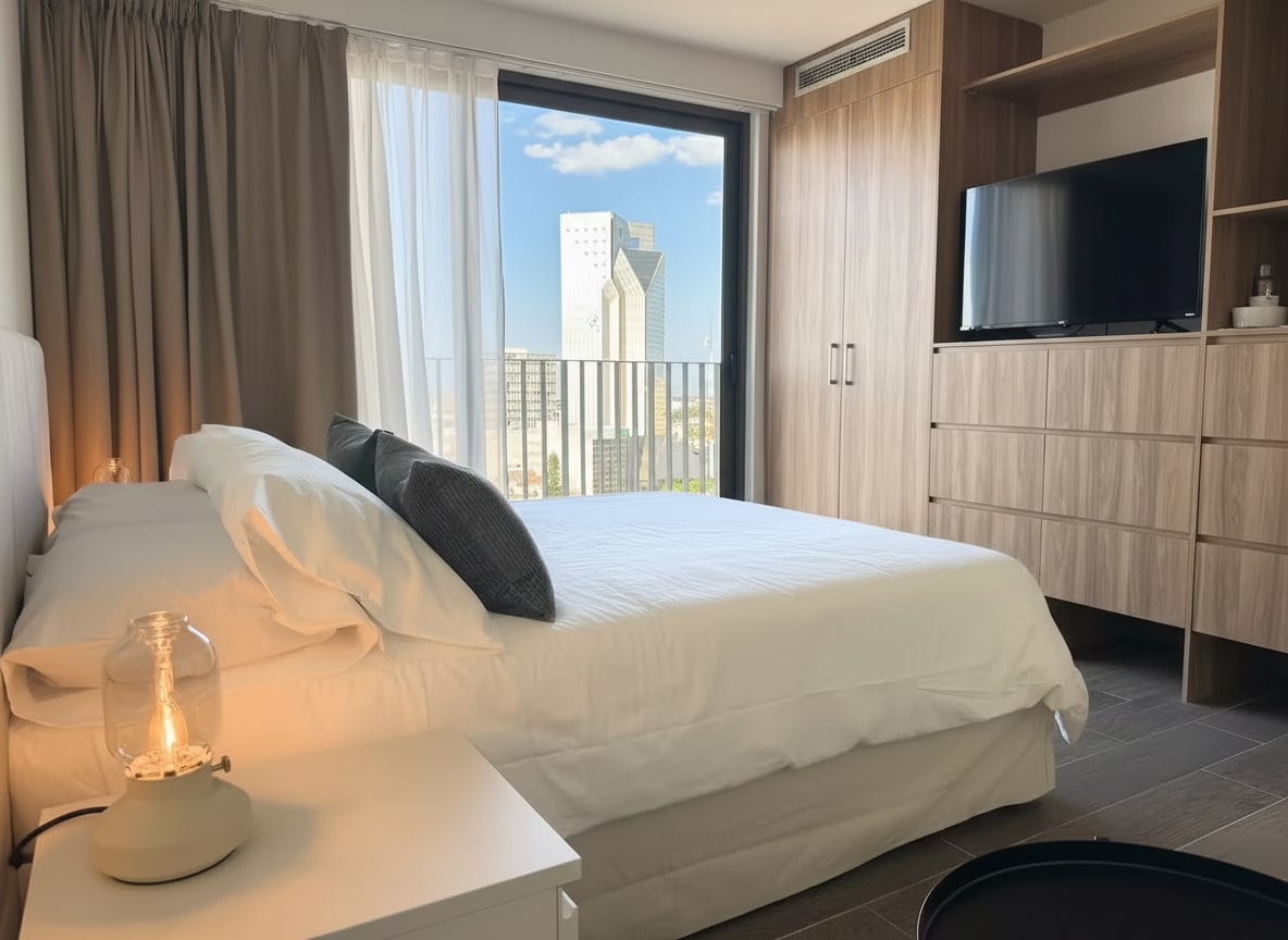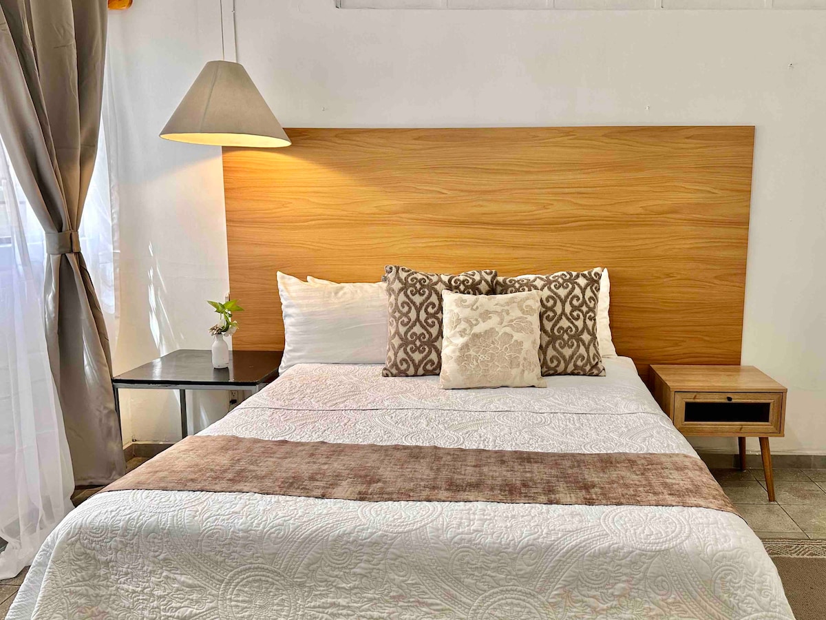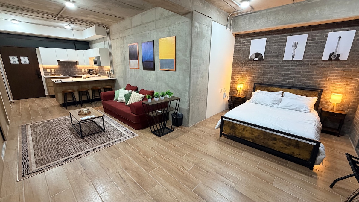 - Acogedor y exclusivo estudio ejecutivo con cama queen-size, escritorio y aire acondicionado. - Balcón para tomar aire fresco. - Cocina equipada. - Ingreso con cerradura inteligente y clave personalizada y exclusiva para cada huésped. - Rooftop panorámico con restaurante en el nivel 9. - Sala de juntas equipada para reuniones profesionales (consultar disponibilidad). - Acceso 24/7 con código personalizado. IMPORTANTE: No contamos con estacionamiento privado dentro de la propiedad.