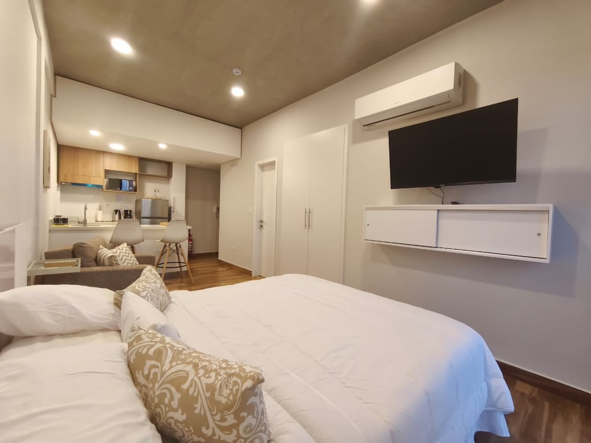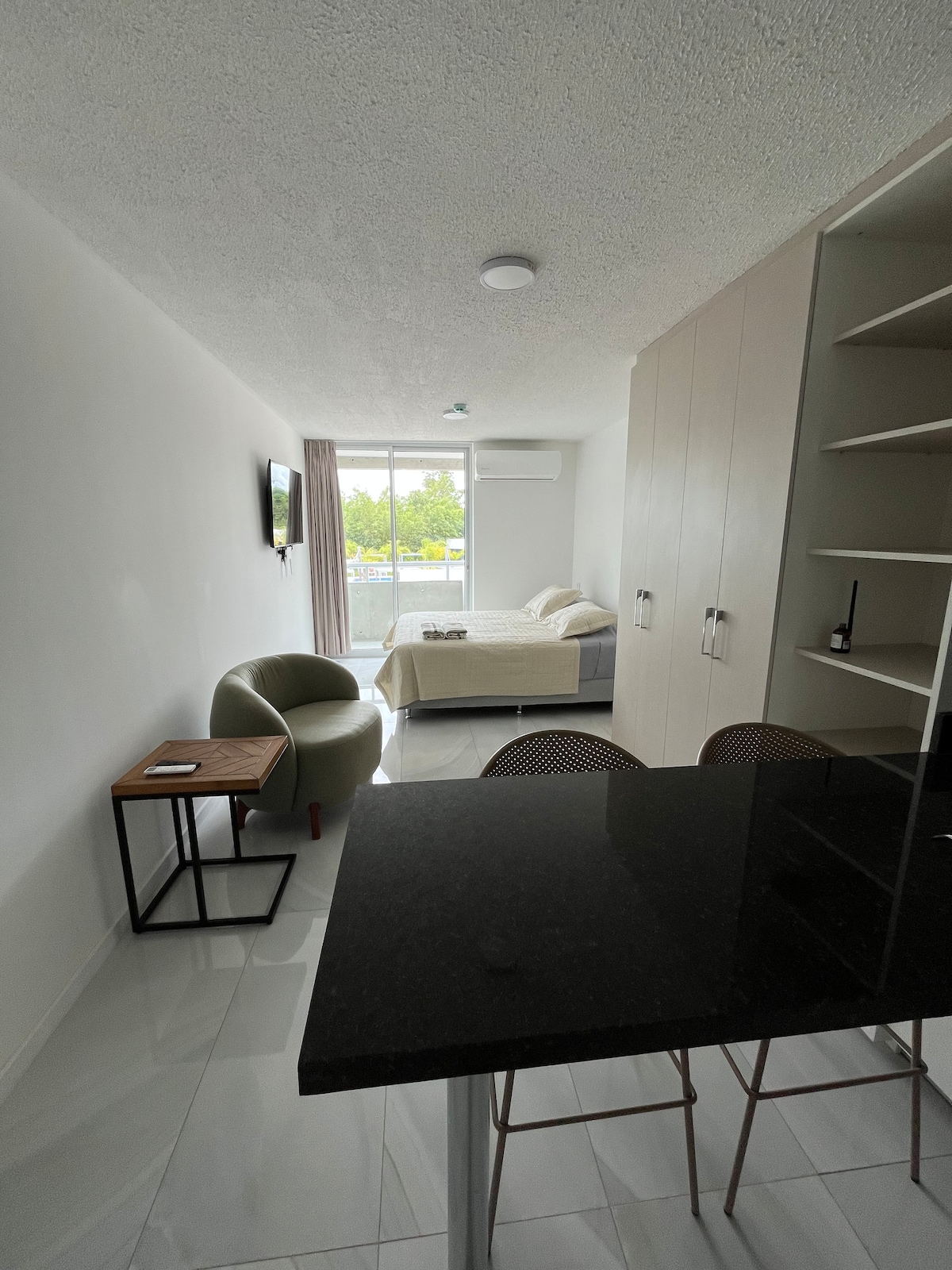 Ideal para alejarse del ruido pero cerca de todo lo que uno necesita, hermoso departamento monoambiente con cama matrimonial y sofa cama. Heladera, horno, cocina totalmente equipada con mármol y todo lo necesario para una comoda estadia. Aire A, frio caliente asi como agua fria caliente en toda la instalación, baños con mamparas y finas terminaciones. Ubicado en una altura con excelentes vistas, en un área verde de 720 m2, amurallado con cercado eléctrico perimetral, totalmente iluminado.