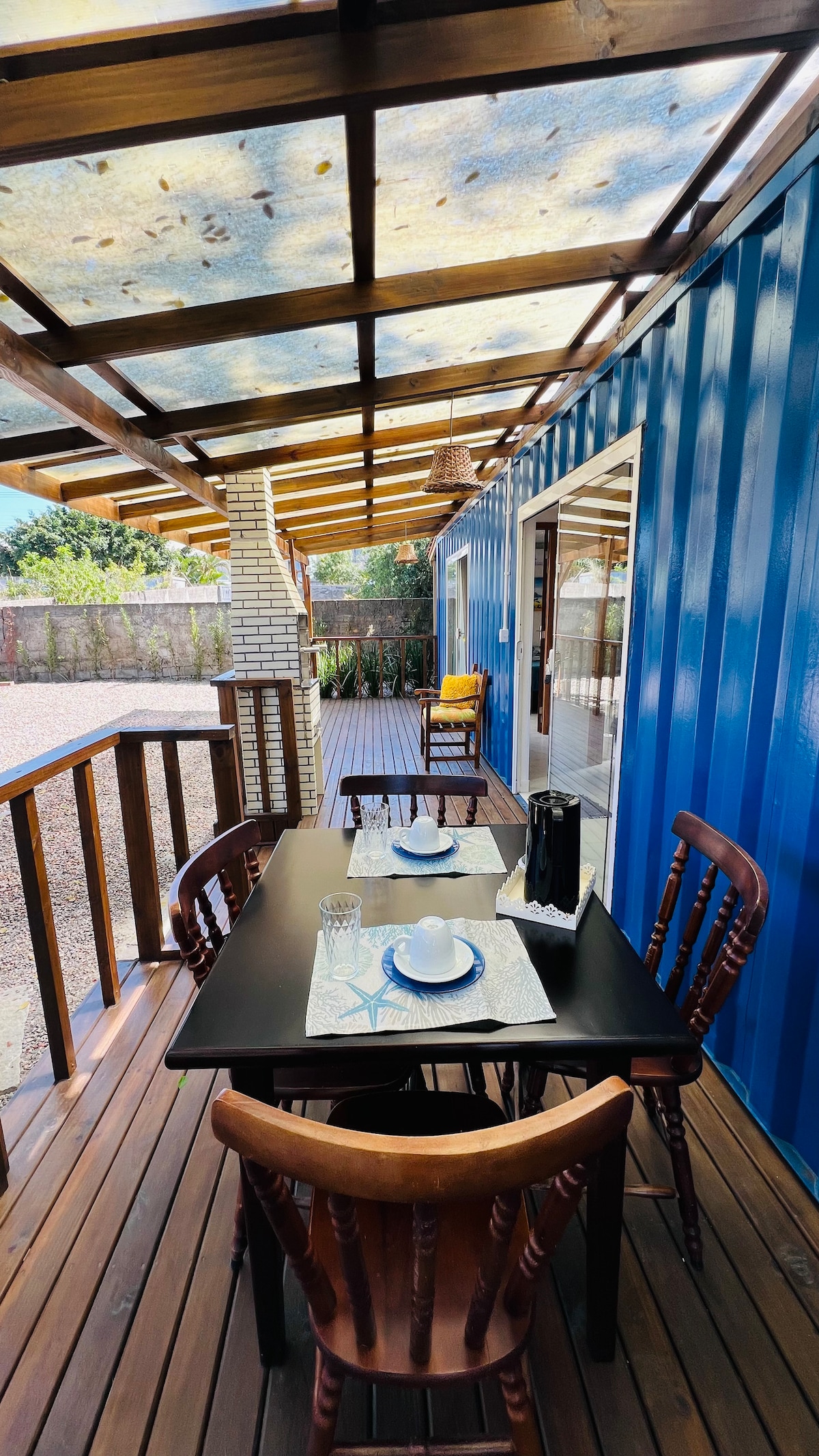 Charmosa e arejada casa container em frente da mata nativa e próxima à Praia dos Açores (700 m). Cozinha completa integrada com a sala, deck, quintal com um lindo jardim, ducha externa, churrasqueira. Internet estável e rápida (250 mb). Próxima das principais belezas naturais e trilhas do sul da Ilha: Praia da Lagoinha do Leste (3 km), Lagoa do Peri (6 km), Cachoeira da Solidão (3 km). O bairro é familiar e tranquilo, com mercado, empório, restaurante, parquinho, praça de esportes.