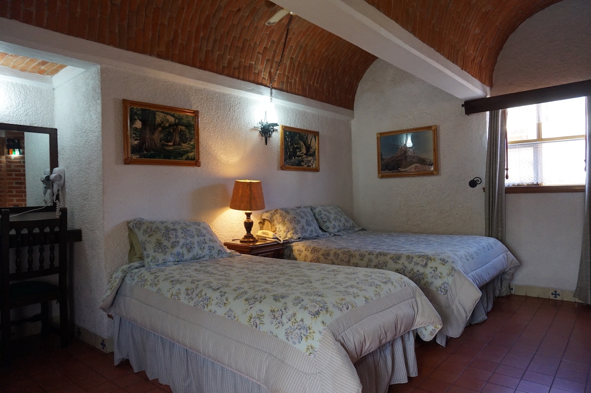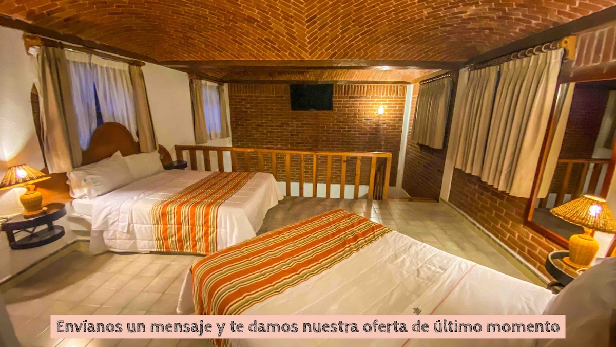 Habitación con dos camas matrimoniales, baño completo, televisión por cable, estacionamiento e Internet gratuito. Forma parte de un pequeño complejo integrado por cuatro habitaciones. Las zonas comunes para huéspedes son estacionamiento, salas en recepción y una bella terraza, en la cual podrás tomar fotos espectaculares . La propiedad tiene excelente vista frontal hacia la Peña de Bernal. En nuestro espacio te sentirás relajado y en armonía con el entorno.