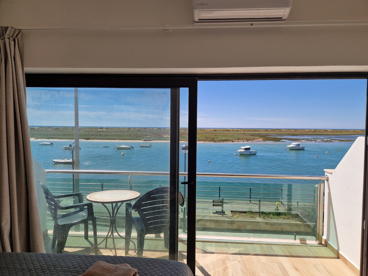 Part of the ‘FantaseaHomes’ rentals collection! • Stunning views of the sea and Ria Formosa National Park • Private terrace / first row sunset 🌅 • Walking distance to buses, trains, and attractions Renovated tiny 1-Bedroom apartment with retro-modern decor and a private terrace offering stunning views of the sea and Ria Formosa National and city. Fully equipped w/ kitchen, cozy living area, modern bathroom. Perfect for relaxing or exploring, with everything you need for a comfortable stay