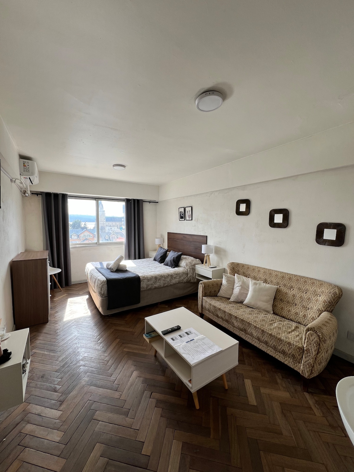 Departamento moniambiente de 50 mts2 con imponente vista sobre el lago y a la Isla Victoria en la zona de Llao Llao. Tiene un pequeño living, cocina completa con horno y microondas, cama king size que dan a un balcón terraza. Baño completo con bañadera Bajada propia a la costa de lago Servicios Wifi Balcón terraza con reposeras Ropa de cama y toallas se cambian c/ 5 días Secador de pelo Estacionamiento privado Exclusivo para parejas No hay desayuno No hay Tv Se cobra limpieza final usd20