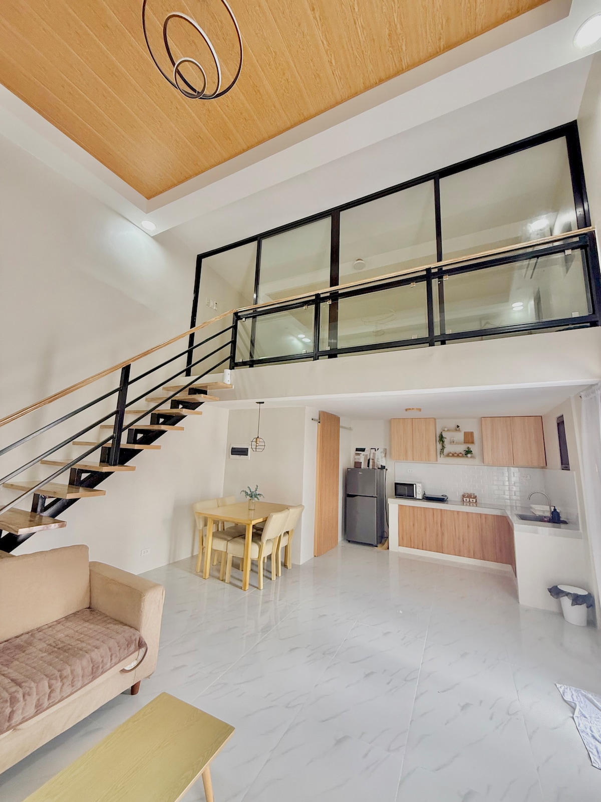 🗝️Key- secured gate and smart lock door access ☕️ coffee area, wine bar 🛋️ cozy living area 👩🍳Fully equipped kitchen and dining space 🛌- Air-conditioned bedroom with 📚study den Bathroom with bathtub and shower 🚽 Separate restroom Free WiFi Entertainment with 55” Smart TV with NETFLIX With board games and Bluetooth Party Karaoke