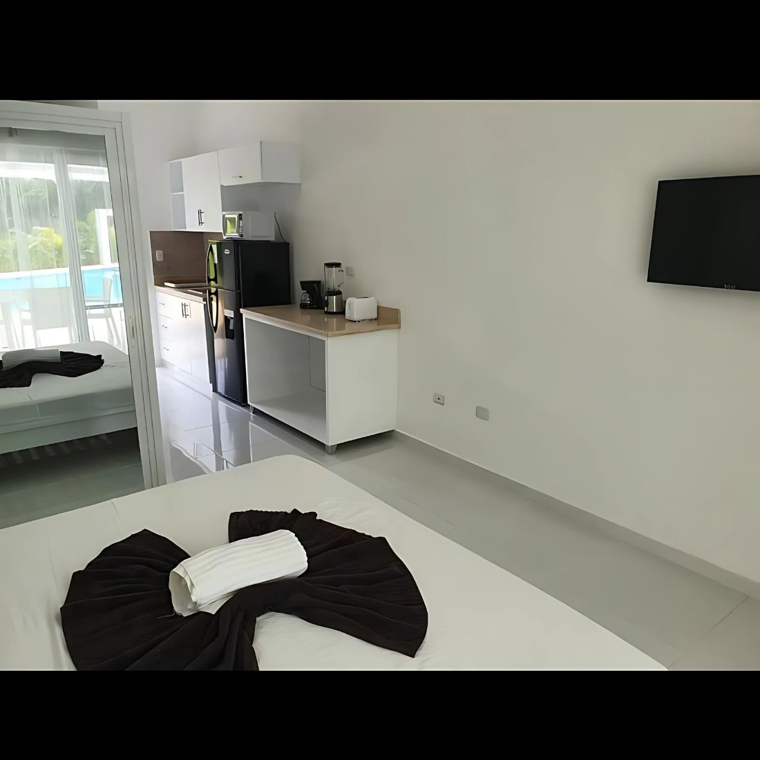 This beautifully located studio, directly by the pool and surrounded by palm trees and tropical plants, offers a peaceful retreat with privacy. It is situated in the Almendra community, ProCab, Cabarete. The complex features a cozy bar with a BBQ area, as well as a relaxing jacuzzi. King-size bed, Fully equipped kitchen, bathroom Private seating area with pool view. Only a 10min walk to the main beach in Cabarete. 2 mountain bikes are available for a small fee of 2 USD daily per bike.