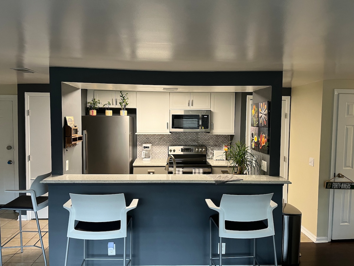 Relax in this spacious, newly renovated condo, just minutes from UNCC. Enjoy the stunning chandelier that greets you as you enter! Admire all-new floors, granite countertops and the cozy decor The property features three cozy bedrooms, one is furnished as an office/TV room with a sofa, two full bathrooms and a deck for fresh air. You can stay entertained with three TVs—70", 50", and 40" as well play some cards provided as well. The kitchen is a soon to be chefs favorite with coffee h20&spices!