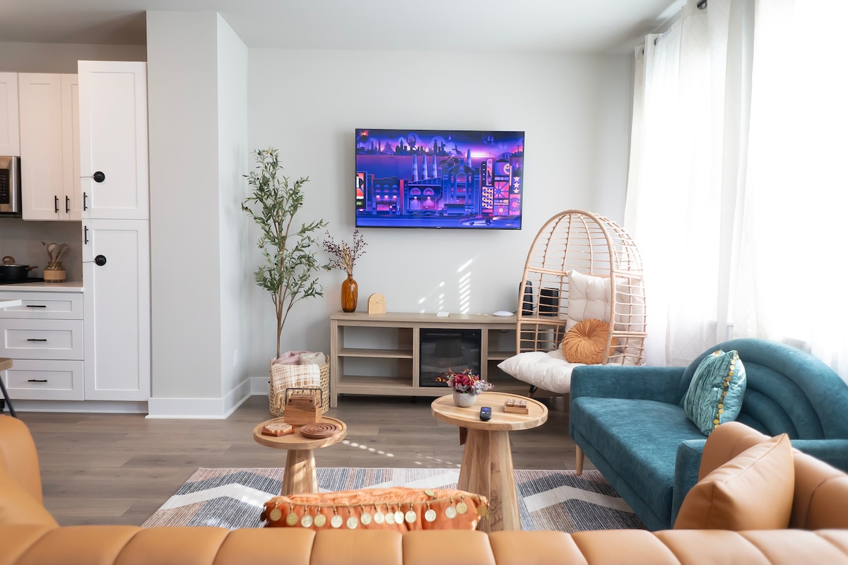 Newly built mid-century modern corner townhouse in Charlotte’s University area! 3 spacious bedrooms (King, Queen, Full + Twin) each with en-suite bath, plus a half bath and 1 extra twin floor mattress. Game room with hockey table, arcade, axe throw & jumbo Connect 4. TVs & fans in every room, modern washer/dryer, fully stocked essentials. Walk to Target, Starbucks & restaurants. 15 mins to Uptown, 20 mins to airport. Perfect mix of luxury, comfort & fun!