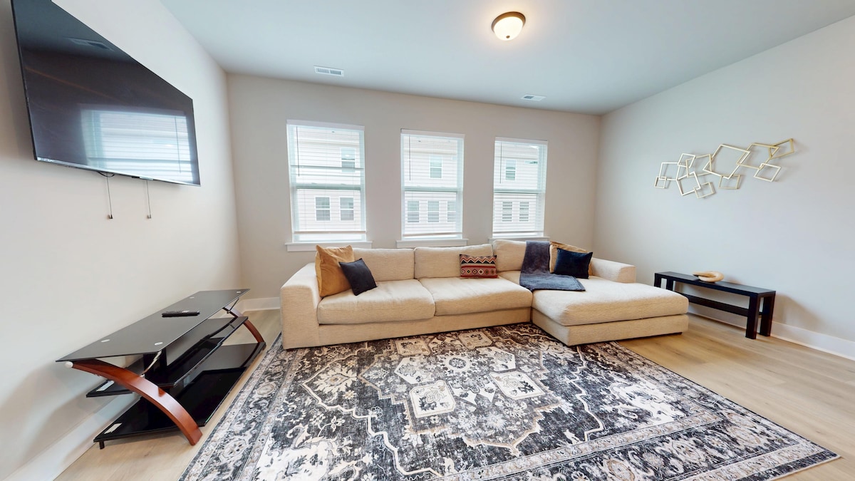 Newly built mid-century modern corner townhouse in Charlotte’s University area! 3 spacious bedrooms (King, Queen, Full + Twin) each with en-suite bath, plus a half bath and 1 extra twin floor mattress. Game room with hockey table, arcade, axe throw & jumbo Connect 4. TVs & fans in every room, modern washer/dryer, fully stocked essentials. Walk to Target, Starbucks & restaurants. 15 mins to Uptown, 20 mins to airport. Perfect mix of luxury, comfort & fun!