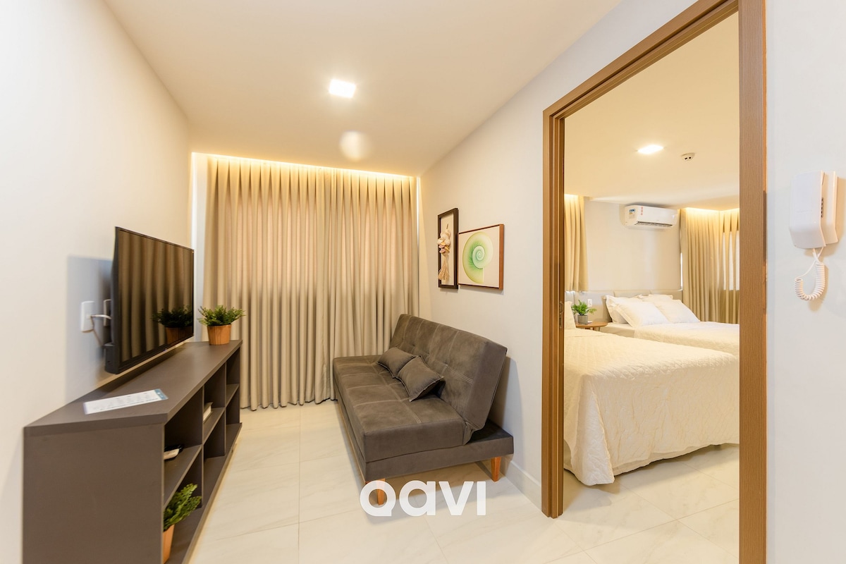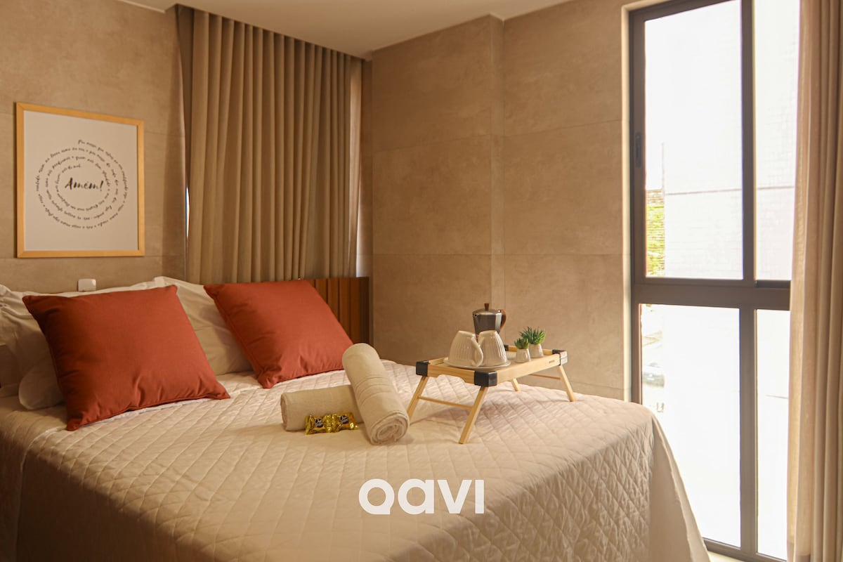 Hospede-se, com estilo, melhor POINT de J.P. a 90 m do mar do Cari Bessa, perto Parques Parahyba. Flat até 4 pessoas, com 1 cama QUEEN OU 2 solteiro + 1 sofá cama casal. 2 ares condicionados. Wi-fi livre, Smart TV, blackout para dormir aconchegado. Cozinha equipada. WC amplo com toalheiro térmico. Aqui vc pode usufruir de facilidades a pé. Eu te ajudarei nisso! Entrada por link, num processo muito simples.🚨ATENÇÃO: café da manhã é OPCIONAL, cobrado por pessoa no local, ñ incluso na diária.🚨
