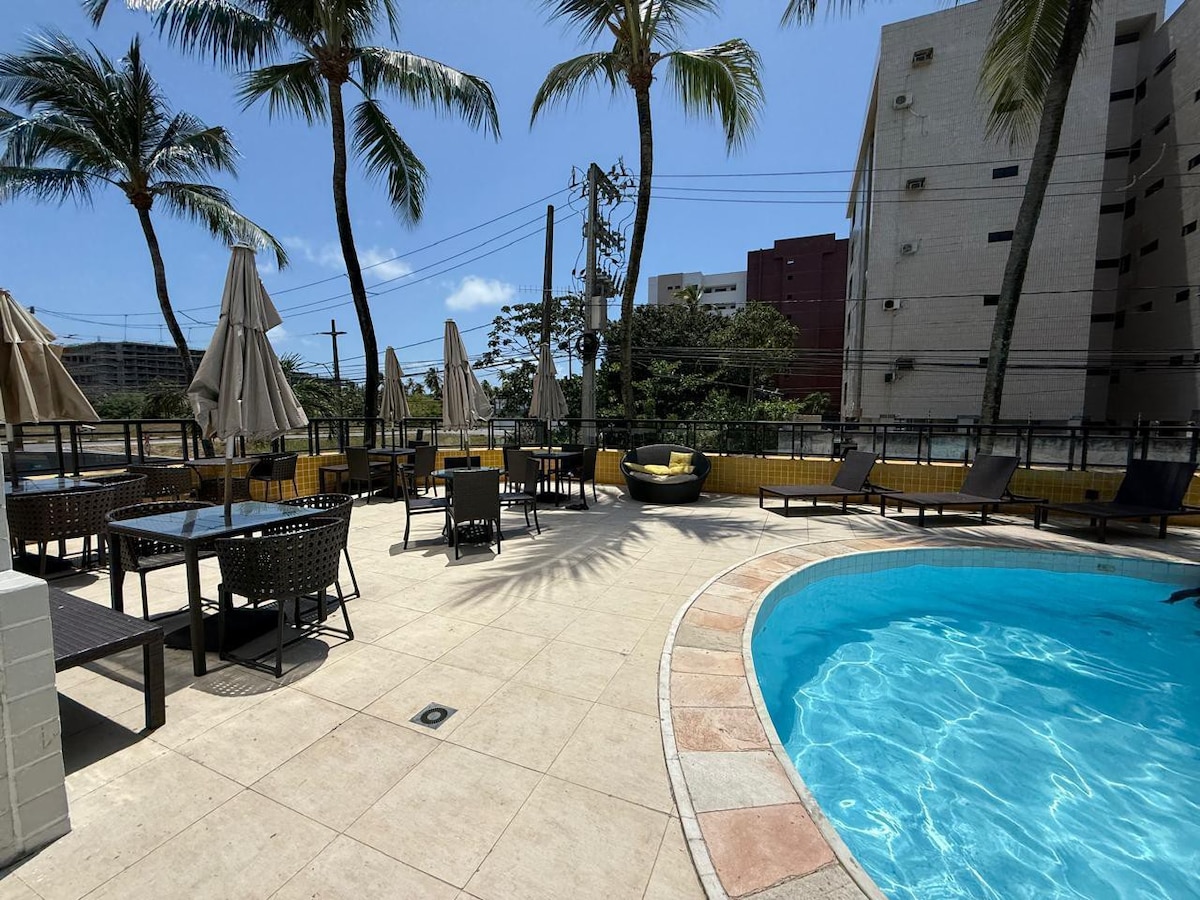 O Apto confortável, sacada de frente para o palco do FASTVERÃO; 750m da praia de ponta de campina; 6 min de distância da orla de intermares que possui vários bares e restaurantes; 15 min da orla de Tambaú; Perto do Por do Sol do jacaré, passeios etc. Dispõe de piscina, churrasqueira, estacionamento gratuito, elevador, segurança 24h, 2 quartos, sendo uma suíte, TV smart, Wi-Fi, cozinha equipada, banheiro com chuveiro elétrico. ACEITAMOS PETS pequenos.